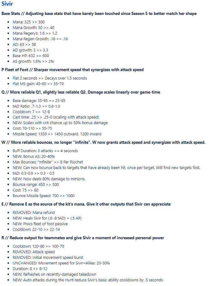 Riot semble un tantinet nerfer les forces de Sivir en early games, réduisant les dégâts et le mana de base de ses capacités, mais lui donne un meilleur scalling en mid-late game. Sa mana global, sa régénération de mana et son AD de base sont fortement réduits, alors que l' AD et la vitesse d'attaque par niveau ont été augmentés ; à noter également que le passif de Sivir est un peu réduit.