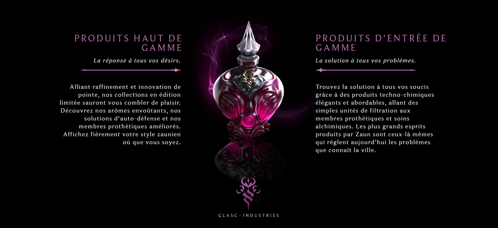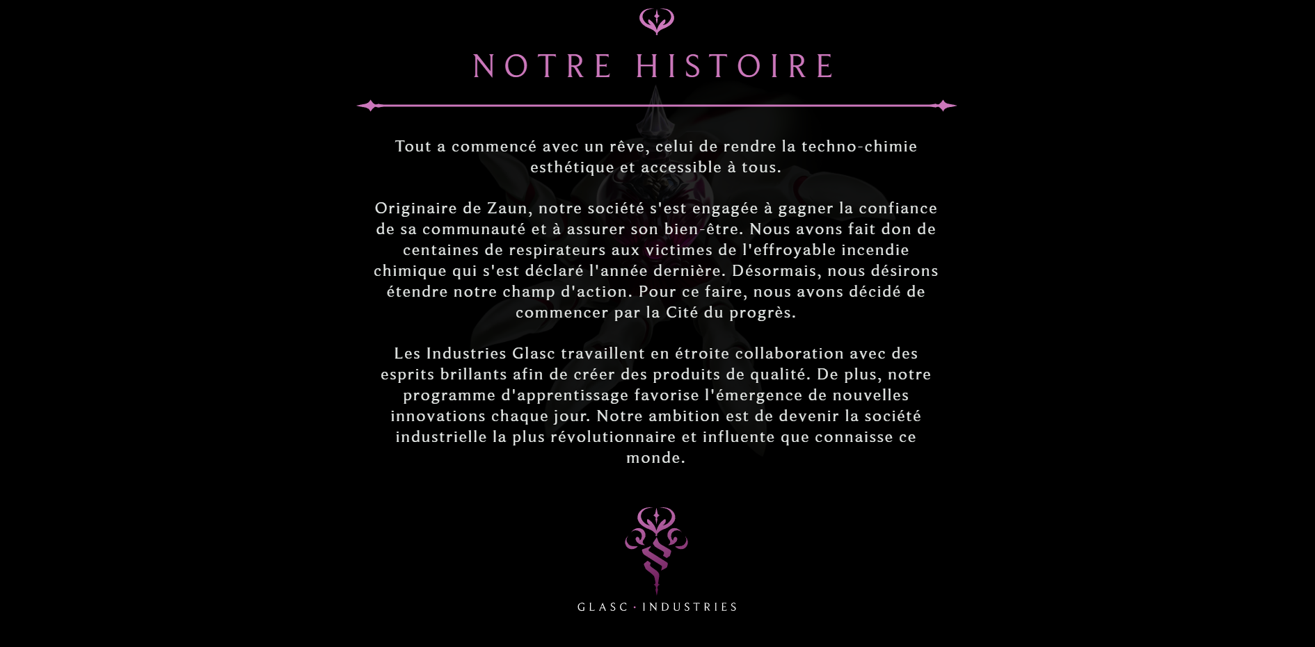 Aujourd'hui, Riot Games a dévoilé un nouveau site Web avec de nouvelles informations faisant allusion à ce nouveau champion. Le site Web fait la publicité d'une société fictive de Runeterran appelée Glasc Industries, un groupe qui cherche à rendre la techno-chimie esthétique et accessible à tous. Originaire de Zaun, la société a été fondée par une alchimiste nommée Renata Glasc, qui apporta sa vision avant-gardiste aux domaines du développement civil, de la technologie et de la philanthropie, et qui travailla en étroite collaboration avec les citoyens et les Barons de la chimie afin de rendre les rues plus sûres.