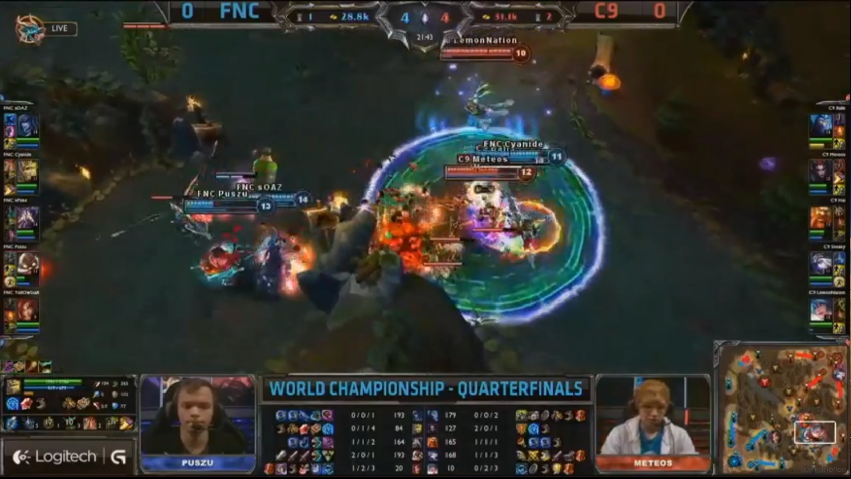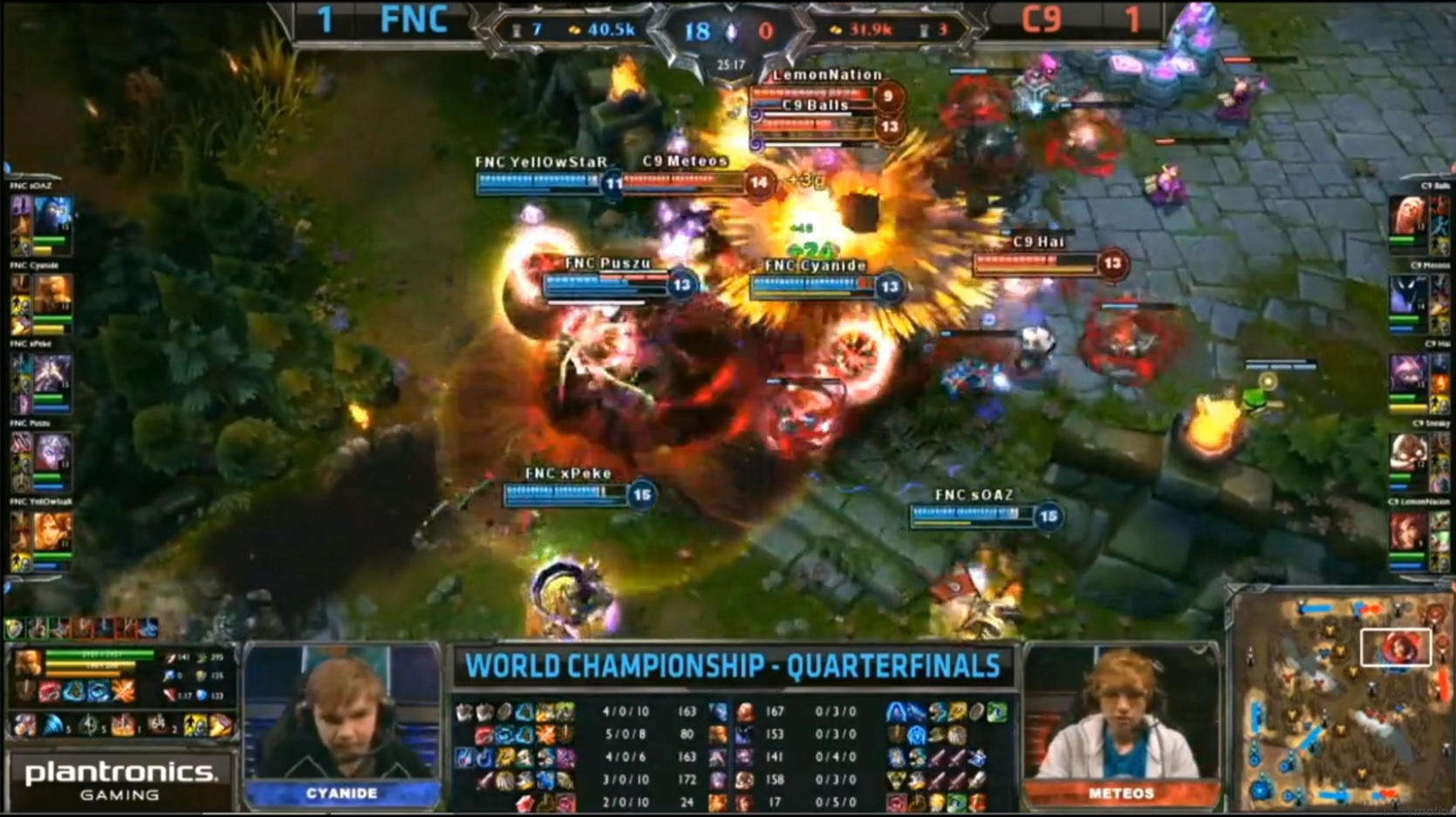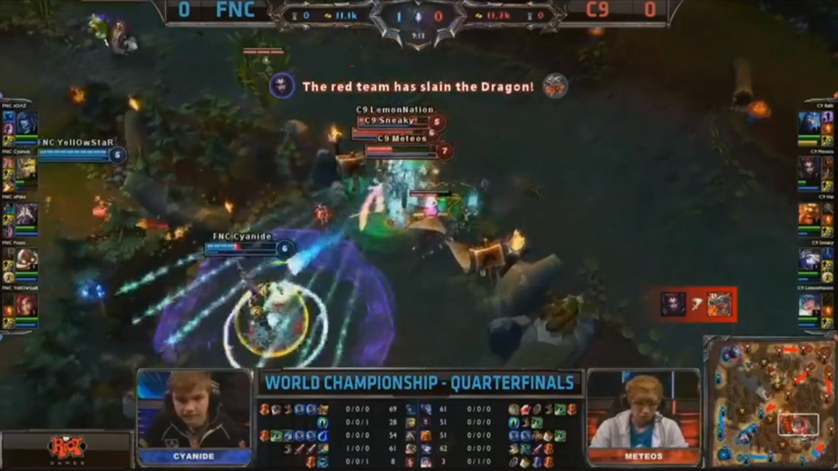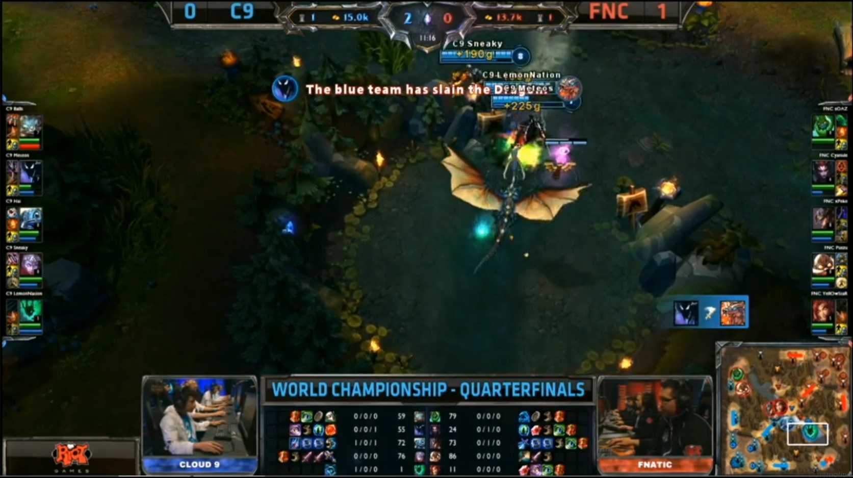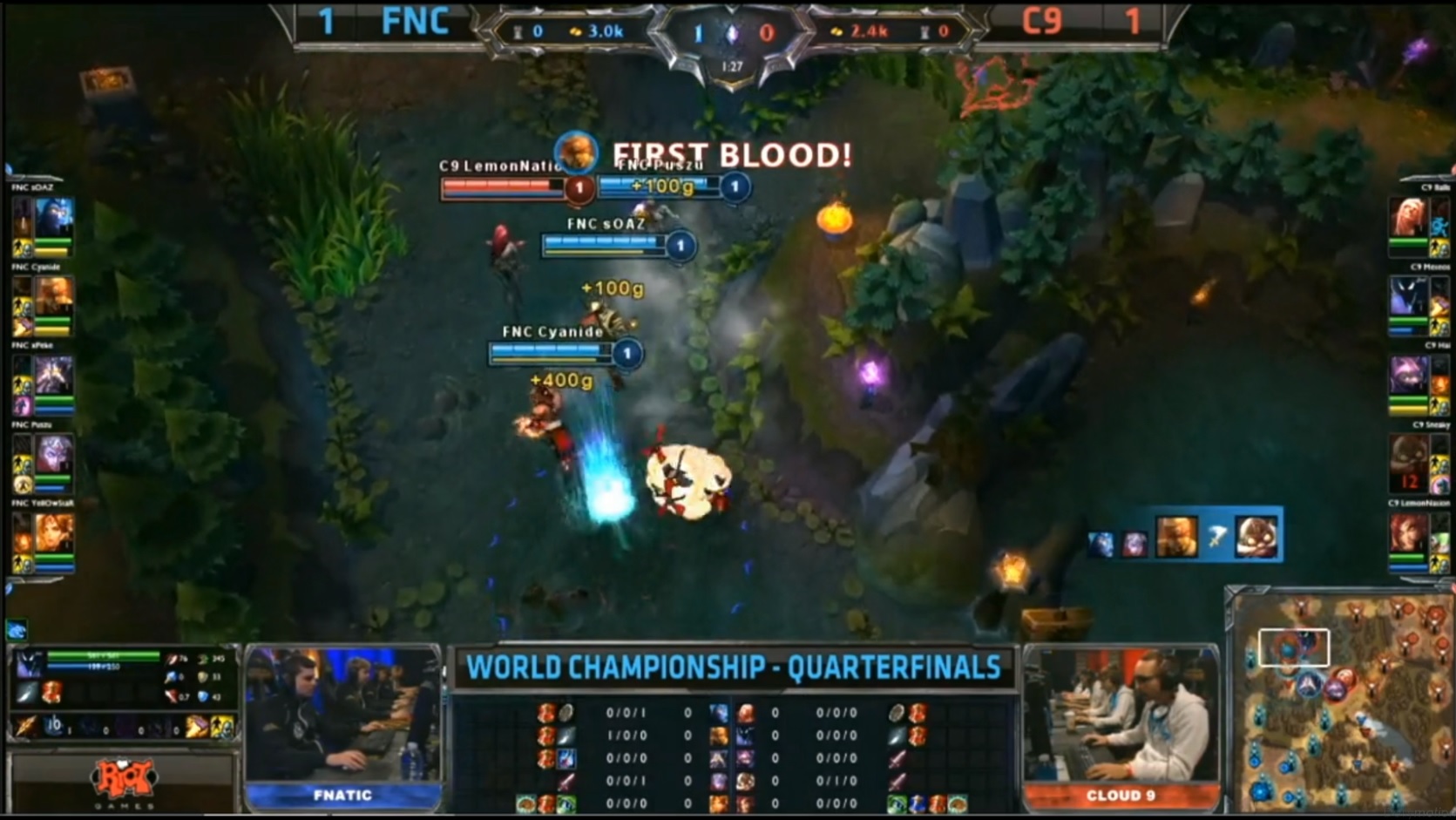 Le premier BO3 de ce quart de finale entre les deux grands gagnants des playoffs, Fnatic et Cloud 9. Les deux duolane ont choisi le top comme terrain de jeu. Les junglers viennent prêter main-forte très tôt dans la game sur toutes les lanes mais malgré les ganks et le firstblood qui tarde à tomber. 7e minute, Sona vient faire un tour en jungle et se fait piéger par Corki, Zyra et Jarvan qui n’en font qu’une bouchée. Alors que les Cloud 9 réalisent le premier drake à la 9e minute, Jarvan tente de le contester, mais peine perdue il tombe dans la foulée.
