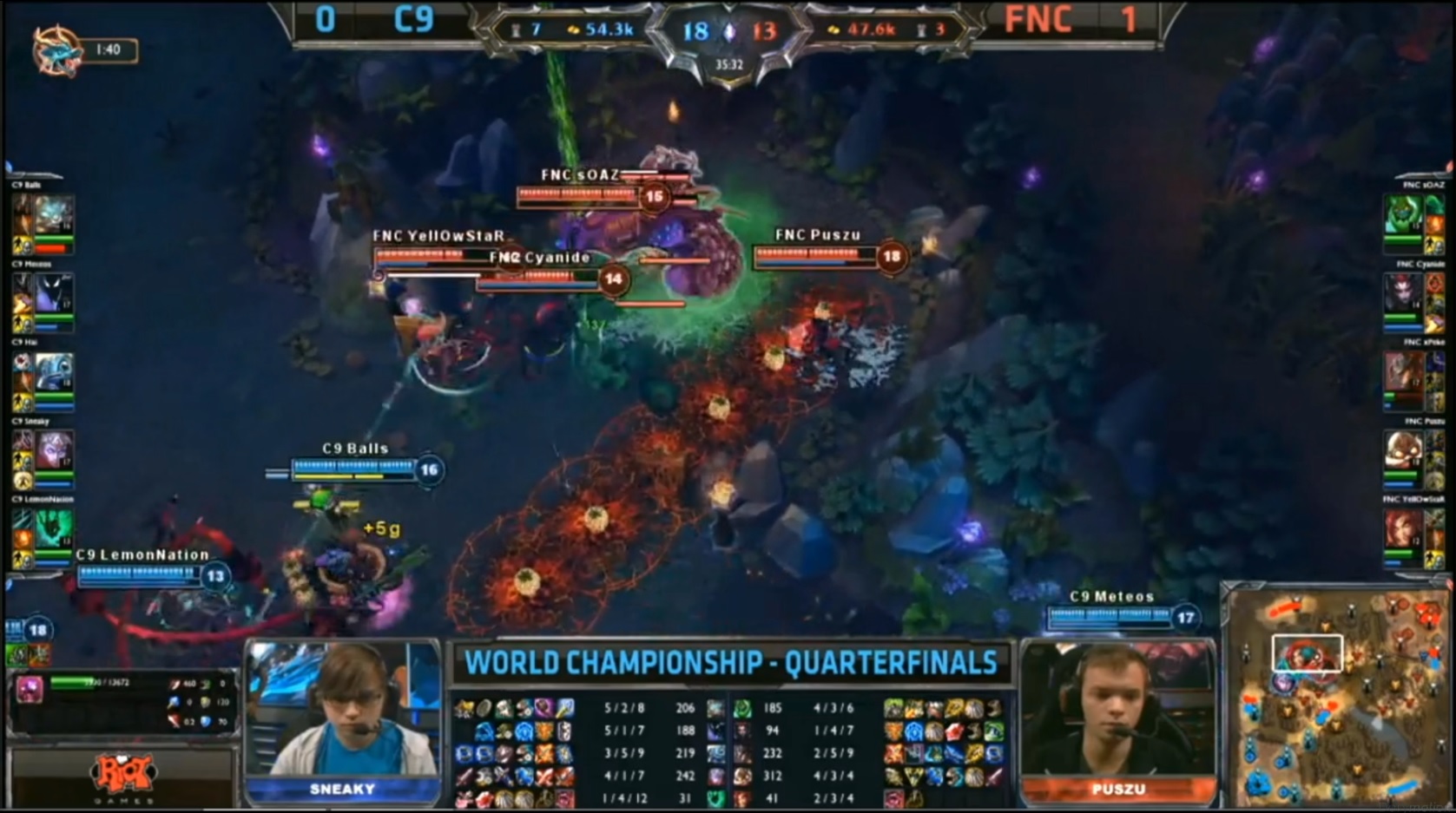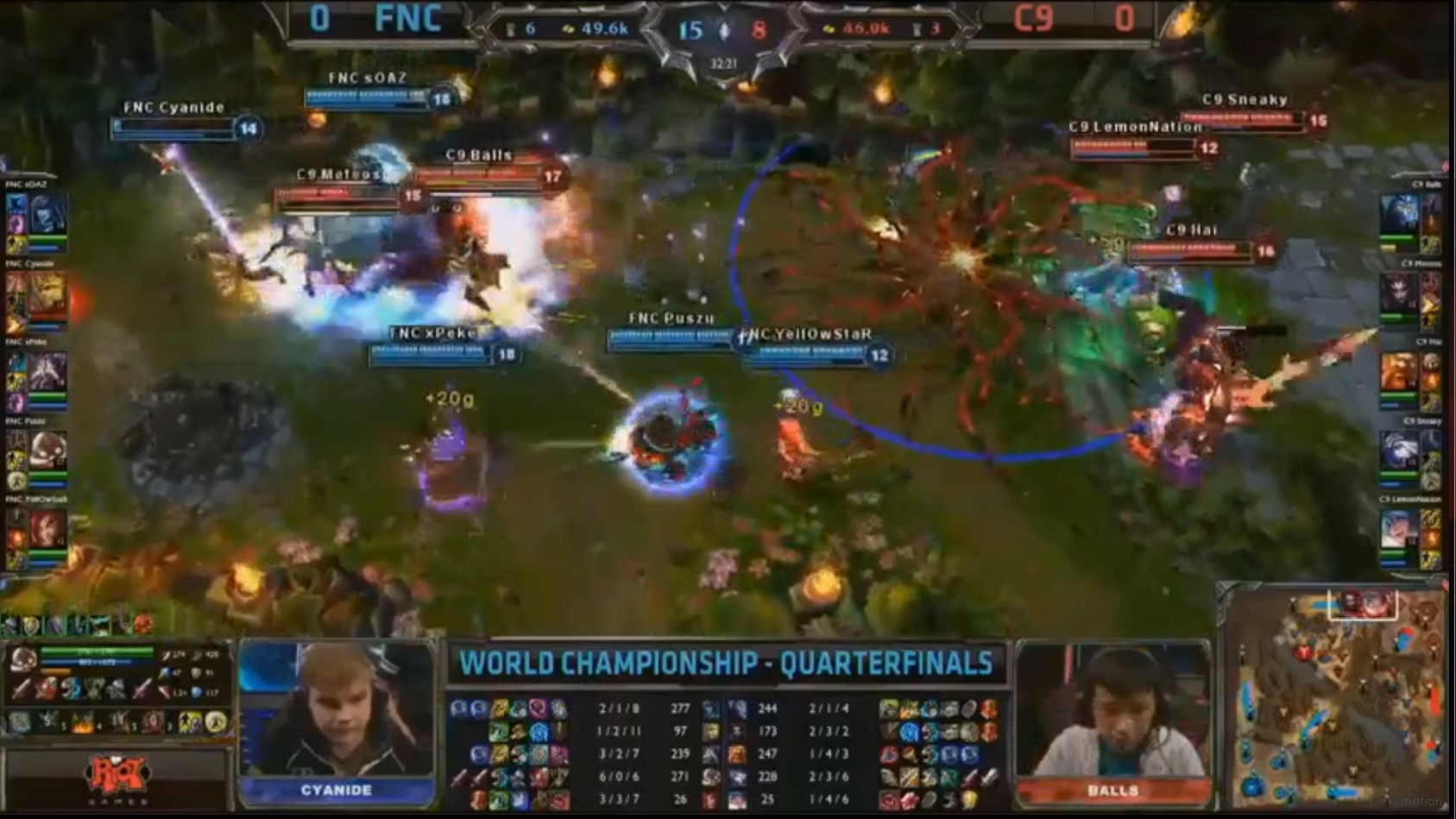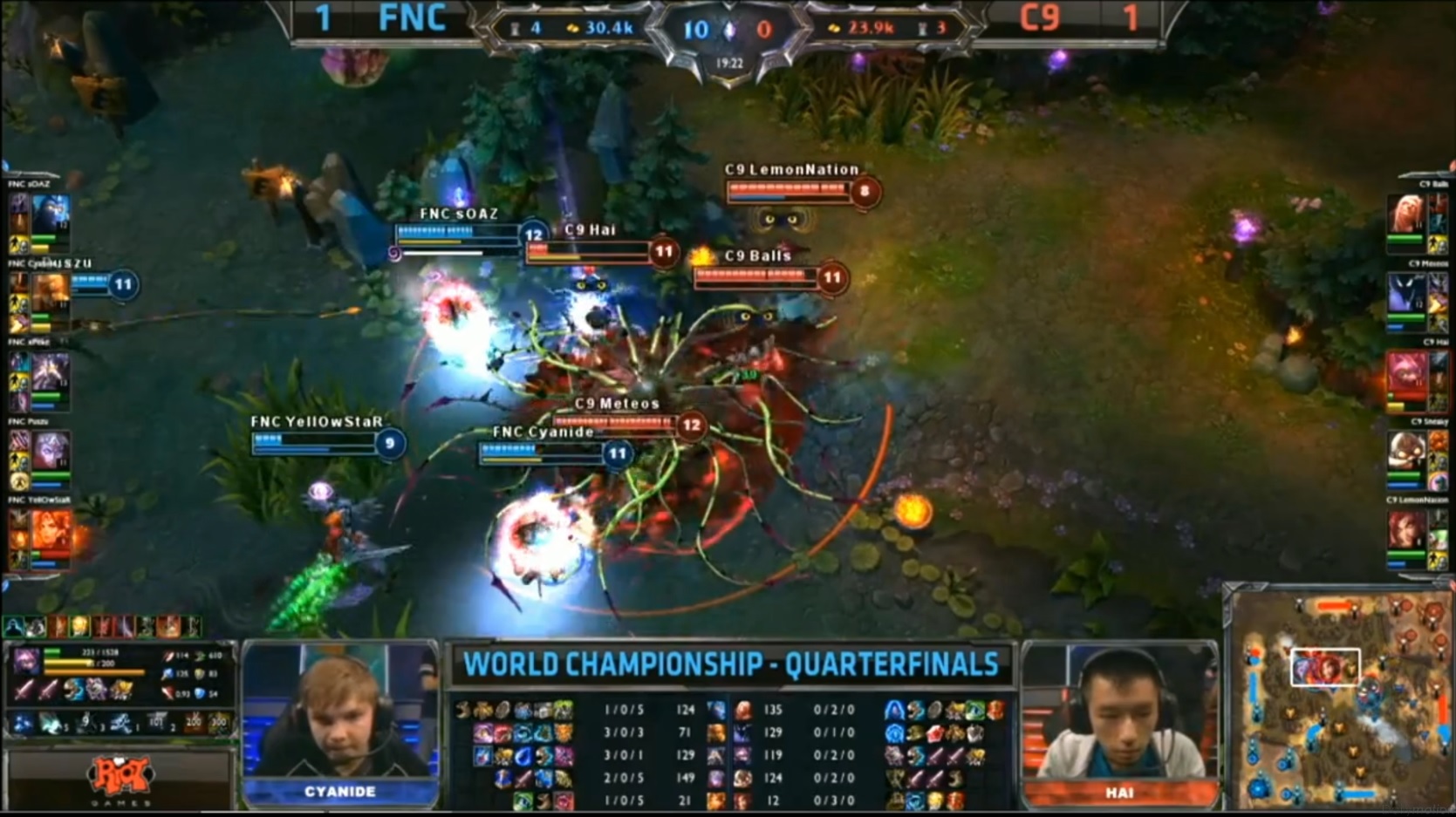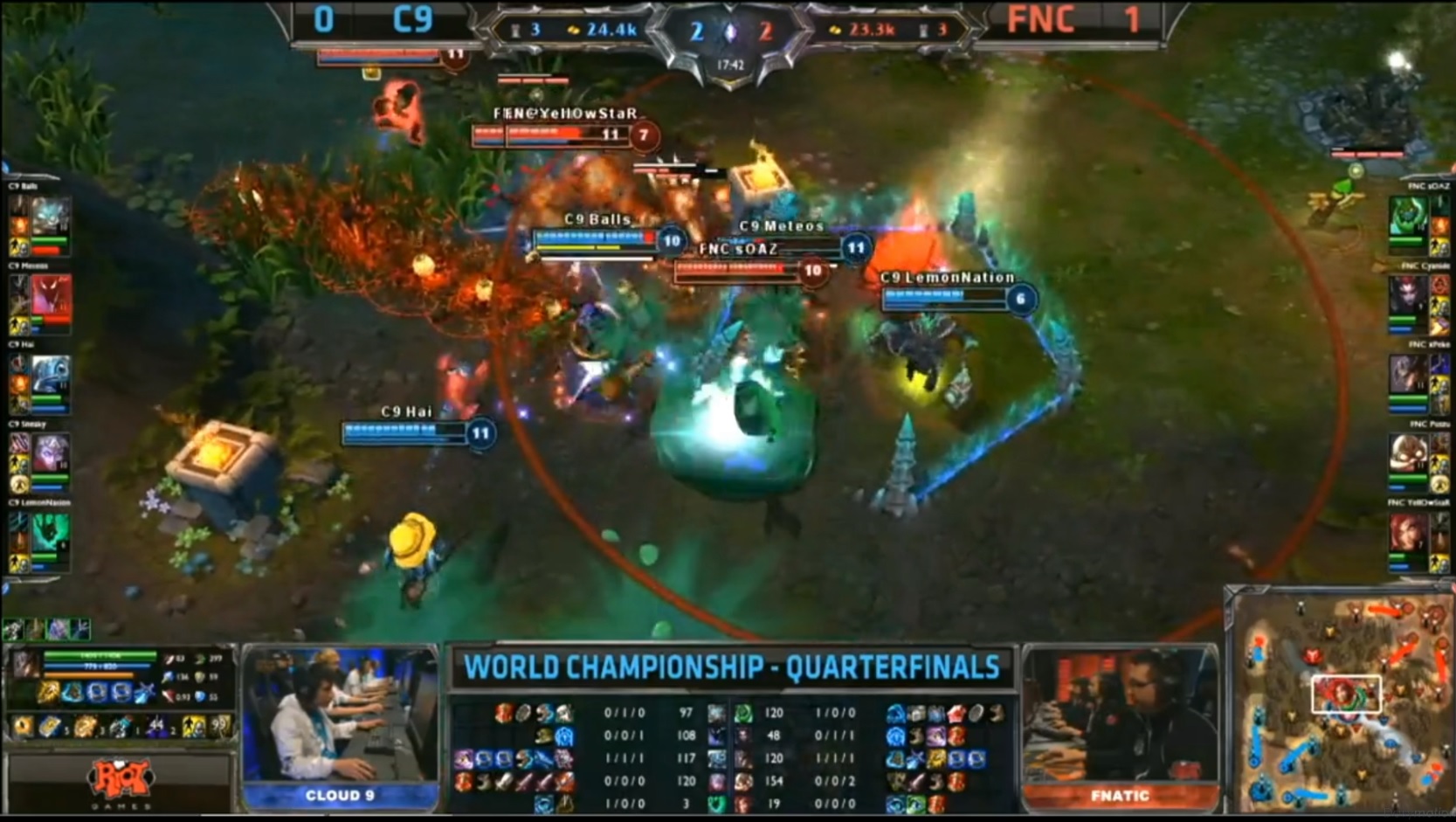 Les Fnatic creusent encore plus l’écart en débarquant en surnombre sur les lanes et en récupérant de nombreux kills. À la 18e minute l’avance des Fnatic est de 10 kills, 6K gold, mais aucun réel teamfight n’a encore eu lieu. Un semblant de teamfight à lieu a la 19e minute avec deux kills récupérés en faveur des Fnatic, mais toujours aucun pour les C9.