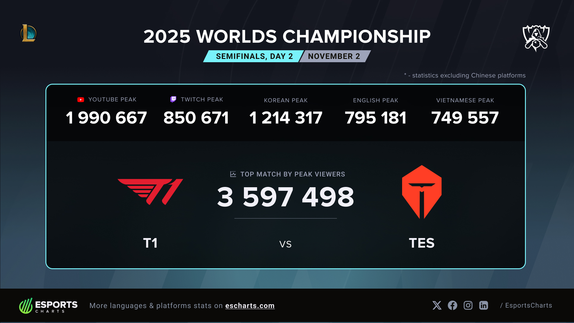 Au terme d’une demi-finale plus ou moins à sens unique, T1 s'est imposer 3-0 face à Top Esports et a décroché sa place en finale des Worlds 2025 de League of Legends, participant ainsi à sa 4e finale de championnat du monde concécutive. L’affiche du jour a généré 3,59 millions de viewers simultanés selon Esports Charts, un total mesuré hors services de streaming chinois. Le trafic s’est concentré sur YouTube, qui a culminé à 1 990 667 spectateurs, et sur Twitch, à 850 671. Les streams coréen, anglais et vietnamien ont également enregistré des sommets respectifs de 1 214 317, 795 181 et 749 557, confirmant la portée internationale de la série.