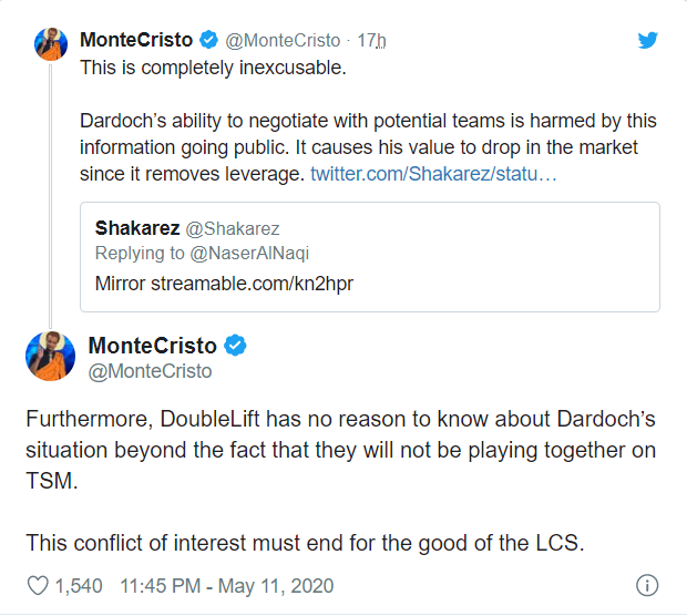 En effet, dans un récent stream de Doublelift, on entend Leena, sa copine, parler au téléphone. On entend notamment de sa bouche que personne ne veut Dardoch... On en déduit donc que Dardoch a été mis sur le marché des transferts et que TSM cherche à s'en séparer en le proposant à d'autres équipes. Le fait que cette discussion soit rendue publique dans un stream pose plusieurs problèmes et peut avoir de graves conséquences.