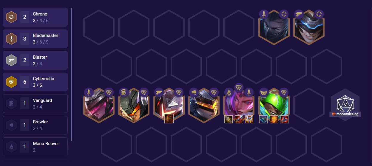 En fin de partie, il faudra atteindre le niveau 8 pour trouver plus facilement Irelia et Ekko. Une fois que c'est fait, assaisoner votre composition avec les deux Chrononautes de votre choix et votre équipe est au complet. Au niveau 9, il n'y a pas grand chose à ajouter donc n'hésitez pas à utiliser votre or pour trouver des champions niveaux 3 (Lucian, Vi, Irelia...). Les Cyborgs ont un late game intéressant. Pas très originale mais solide, les Cyborgs sont indémodables.