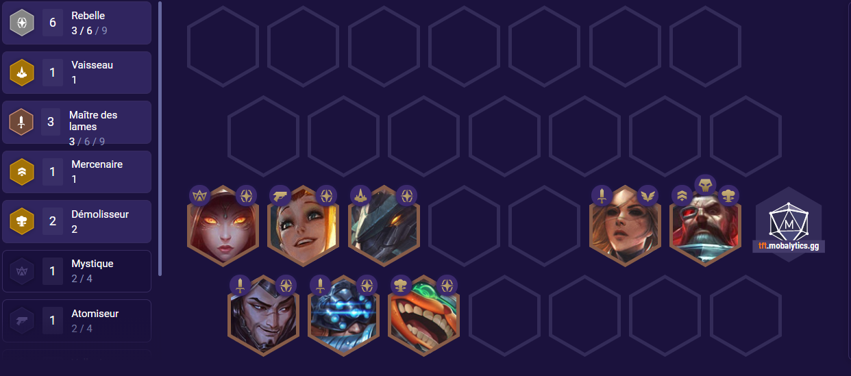 Quand on joue Rebelle, on décide généralement de jouer avec au moins 6 champions de cette origine, ce qui demande un certain investissement. Difficile donc de chercher une autre grosse synergie, si ce n'est celle assez évidente de Maître des Lames pour permettre de faire briller Maître Yi et Yasuo. Avec une Kayle (ou un Irelia) transformée en Rebelle, c'est une composition très solide.