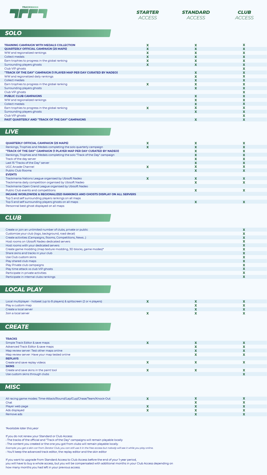 - Club Access (29€99 par an ou 59€99 pour trois ans) : le Club Access est dédié aux joueurs faisant régulièrement des compétitions, s'impliquant dans l'aspect social du jeu et cherchant à personnaliser leur contenu. En plus de toutes les fonctionnalités précédentes, on compte la création et le fait de rejoindre les clubs, la création de campagnes, de compétitions, la création de serveurs dédiés, le modding, le partage de campagnes et d'autres fonctionnalités. Cette version est la seule qui permette de participer à l'Open Grand League, le qualifier pour la Trackmania Grand League.