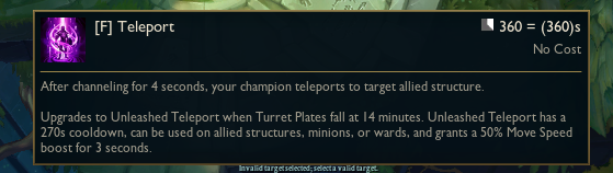 Après une canalisation de 4 secondes, téléporte votre champion vers la structure alliée ciblée. Se transforme en "Unleashed Teleport" au bout de 14 minutes.