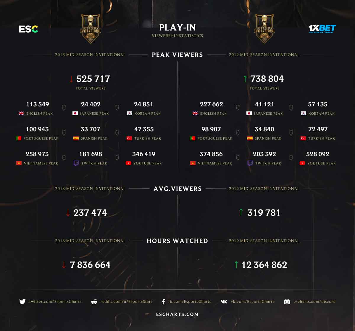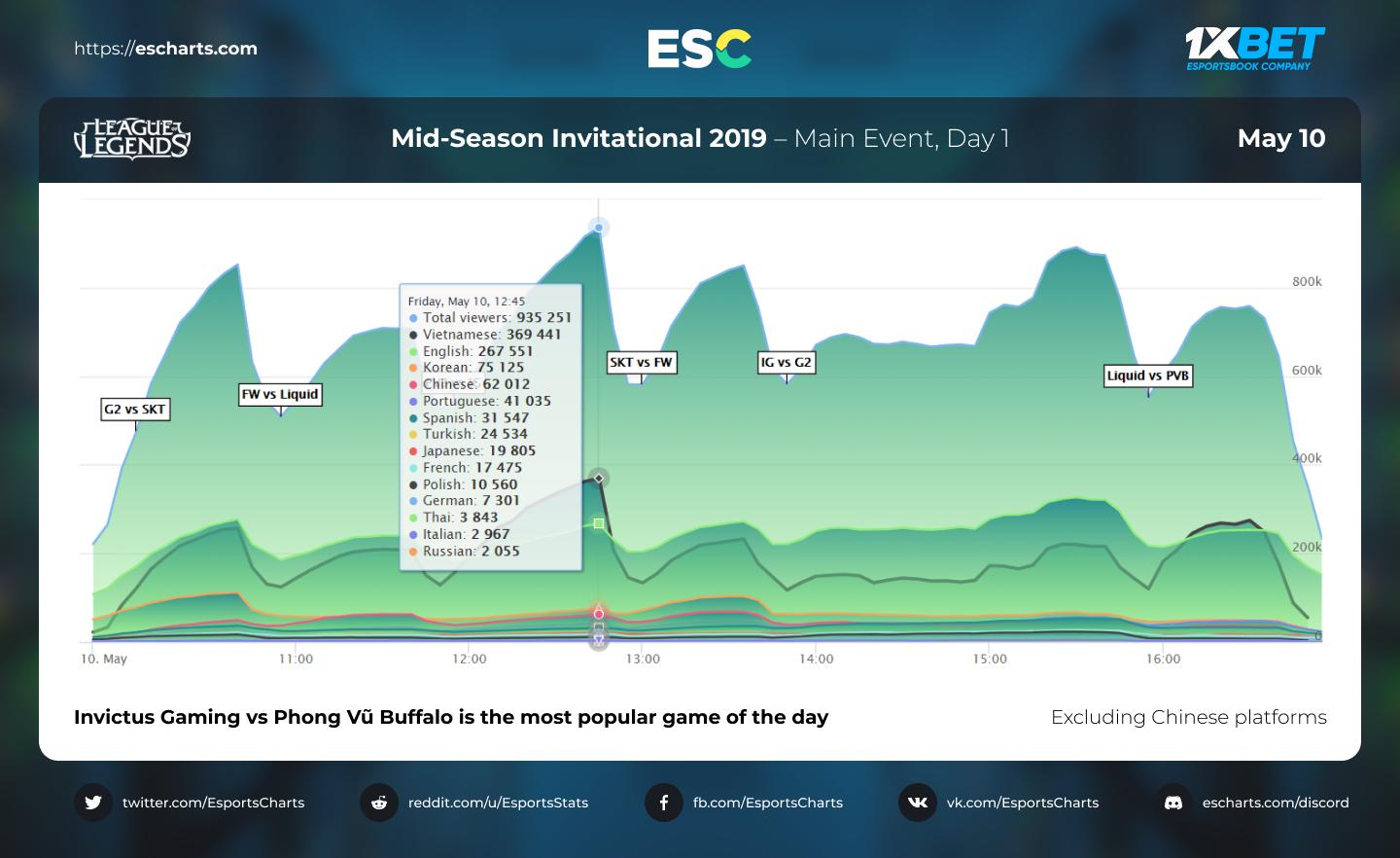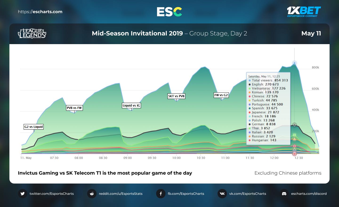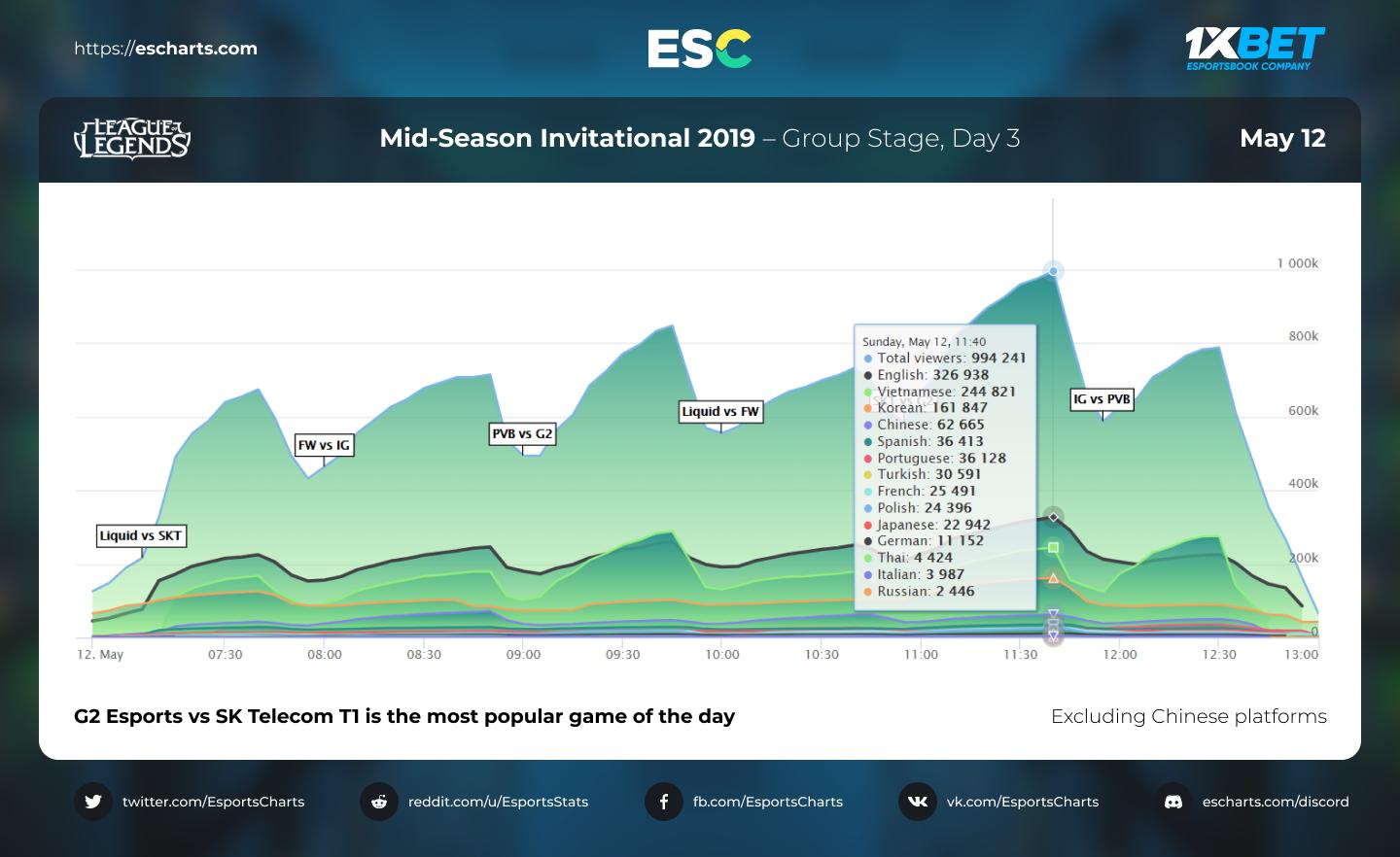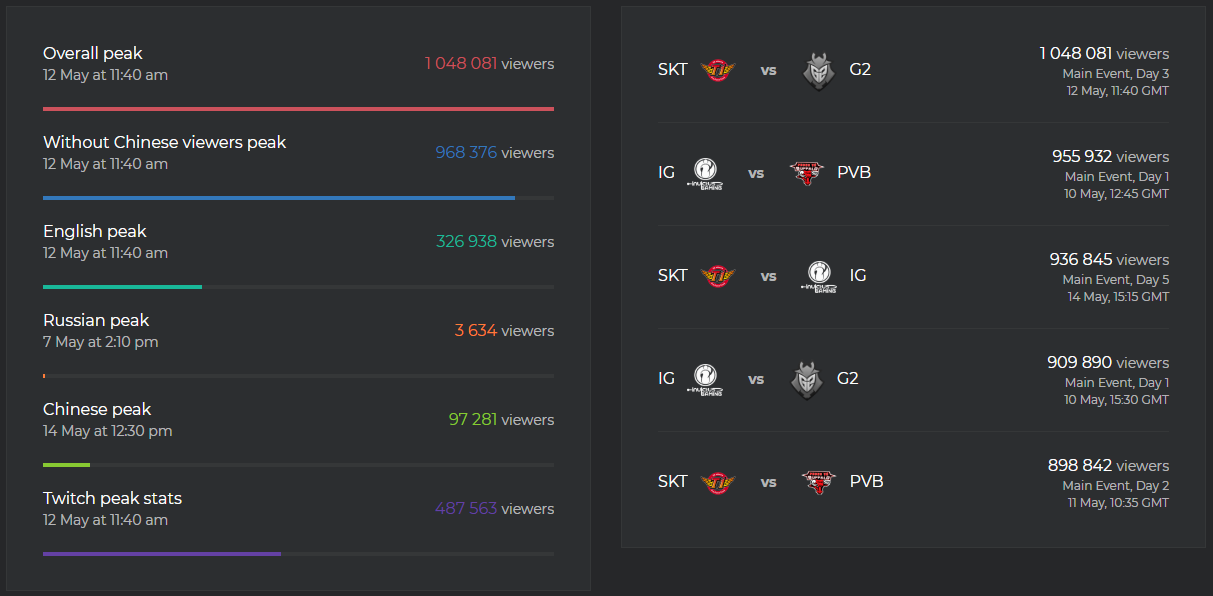 Le Mid-Season Invitational 2019 est maintenant terminé et G2 Esports est allée s’imposer en finale du tournoi face à Team Liquid sur un score de 3 à 0. Avant que ne soit donné le coup d’envoi du segment estival, dernière ligne droite avant la course à la qualification pour le Championnat du monde, nous profitons de la pause pour faire un petit retour en arrière ainsi qu'un point sur l’audience du Main Event du MSI 2019, phase de groupe et playoffs confondus. Le site Esport Charts a rassemblé les chiffres des saisons 2018 et 2019 et de la même manière que pour les Play-In (sans prendre en compte les chiffres des différentes plateformes chinoises), la phase de groupe du Main Event a attiré plus de spectateurs que l’année dernière avec un pic d’audience à 1 048 81 viewers lors de la rencontre SK Telecom T1 contre G2 Esports (3e jour / match retour) ; le pic de viewers de 2018 était de 734 420. En deuxième position, nous retrouvons le match Invictus Gaming contre Phong Vũ Buffalo (955 932 viewers) et en troisième place, SK Telecom T1 contre Invictus Gaming (936 845 viewers). Lors de la phase Play-In, le pic enregistré était de 738 804 viewers lors de la rencontre Vega suqadron contre Phong Vũ Buffalo.