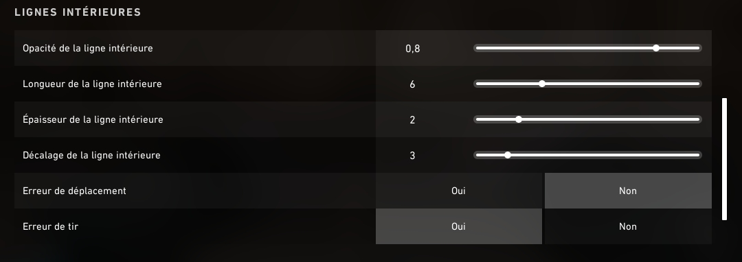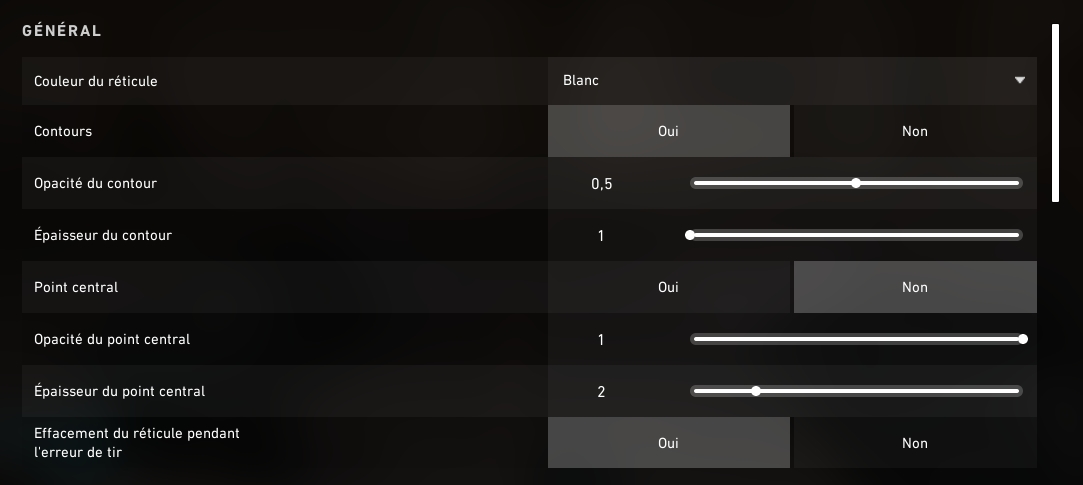 Ces derniers paramètres apparaissent sur chacune des parties du crosshair : ils sont donc aussi disponibles sur le point central, et sur les lignes intérieures et extérieures.