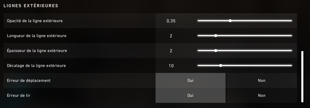 Pour les deux lignes, vous pourraient décider ou non de leur présence, de leur longueur, mais aussi de leur position par rapport au centre de votre écran (là où vous visez). De plus, vous pouvez décider de s'ils affichent l'erreur, c'est-à-dire si les lignes vont s'écarter ou non pour montrer votre zone de tir possible, ou non, que ce soit pendant le déplacement ou pendant le tir.