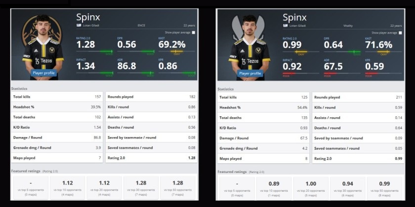 Sauf que cette solution n'aura finalement porté ses fruits que pendant les deux premiers mois du joueur, ce dernier ayant montré ses limites lorsque subitement son rendement a baissé sur le serveur. Lui qui devait soulager Mathieu "ZywOo" Herbaut, seul joueur capable de renverser l'issue d'une rencontre par sa seule présence, n'a plus été en mesure de le faire et cela dès les qualifications pour Rio au Intel Extreme Masters Road to Rio 2022: Europe RMR B. Si la cause de cette chute brutale des performances de l'Israélien demeure à ce jour inconnue, on constate qu'à l'heure actuelle il n'est toujours pas parvenu à retrouver le niveau individuel qu'il avait chez ENCE. Pire encore, au fil des jours il décline sans qu'aucune solution ne semble être trouvée en interne afin de récupérer ce fameux « fire power » que réclamaient tant les joueurs lorsqu'ils ont pris la décision de se séparer de misutaaa. Pour donner un ordre d'idée précis, Spinx chez ENCE c'était une moyenne de 1,15 de rating sur les 8 premiers mois de l'année 2022, alors que sous les couleurs de la Team Vitality c'est plutôt 1,04, avec un Major où il est même tombé sous la moyenne à 0,94 ce qui en fait l'un des joueurs les moins performants de la compétition bien au-delà du top 50.