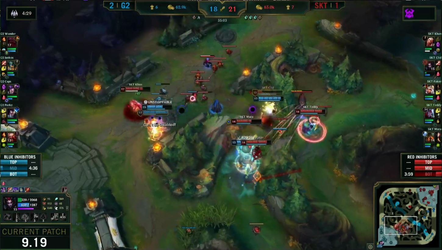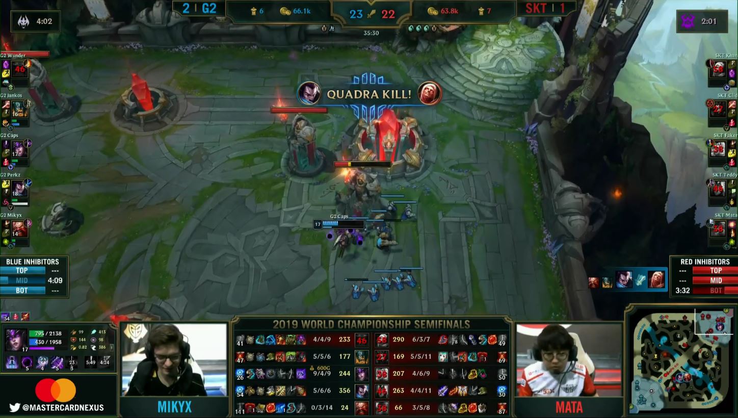Le combat prend alors place à la sortie de la base des G2 : les SKT ont précédemment pris un bon teamfight, et s’emparent de l’inhibiteur midlane. Première erreur, alors que les G2 gaspillent des ultimes et que SKT semble pouvoir s’en aller, les Coréens décident de revenir dans la base ennemie. Hésitant entre rotation et engage, étant alors en supériorité numérique, ils scellent leur destin.