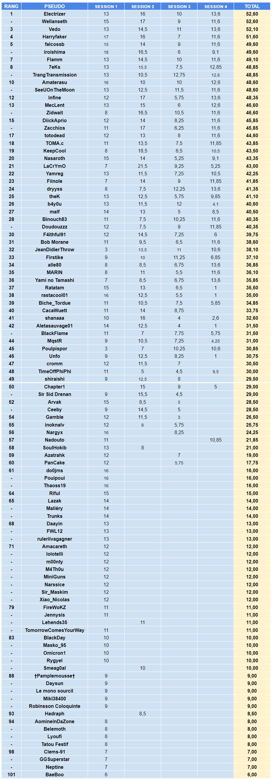 On a beau mettre des paris qui rapportent 0.60 point, 0.75 point ou encore 1.25 point, y'en a toujours qui font les mâlins et terminent le concours avec le même nombre de points. On vous presque-déteste. Cette année, le scénario se reproduit donc avec Electrizer et Wellanseth qui culminent en tête du classement avec 52.60 points, juste devant Vedo et ses 52.10 points (qui prend ainsi la troisième place).