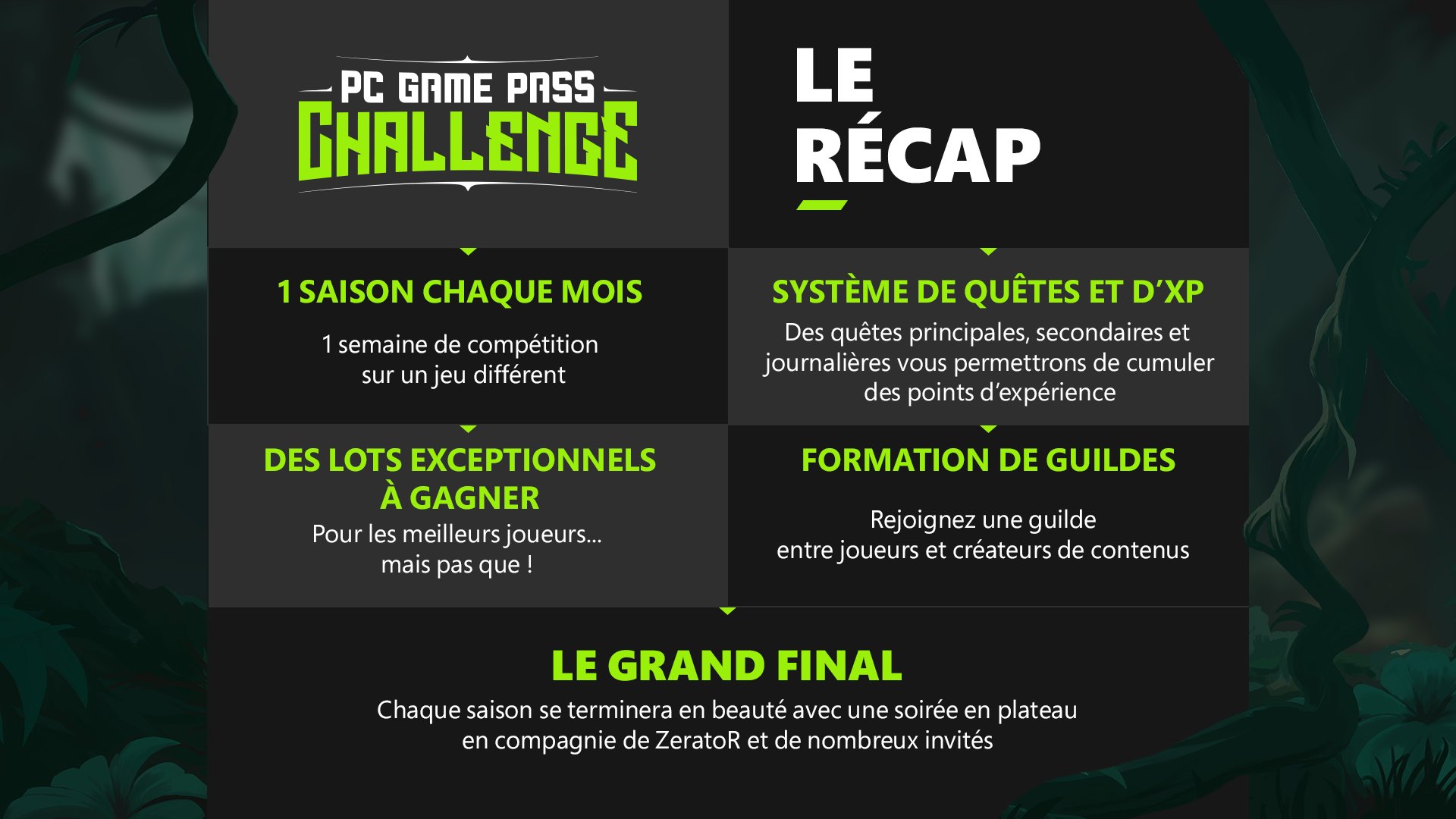 Le Game Pass Challenge est une compétition mensuelle mettant à l'épreuve les participants dans un ensemble de quêtes à réaliser sur un jeu spécifique du catalogue PC Game Pass. Mesurez-vous aux autres et hissez-vous au sommet du classement individuel pour remporter des récompenses exclusives. Voici les principales informations révélées pendant le live de ZeratoR du 6 novembre :
