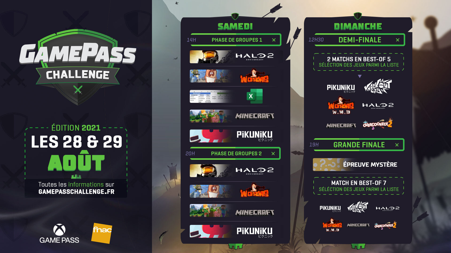 96 joueurs, répartis en 48 duos, s’affronteront lors du Game Pass Challenge 2021 ! Ils devront s’affronter sur 7 titres différents issus du Xbox Game Pass ainsi qu’une épreuve mystère afin de décrocher la victoire et une part des 30 000€ de récompense. Tous les joueurs, après phase d’inscription et de sélection, recevront un code Game Pass afin de s’entrainer dans les meilleures conditions.
