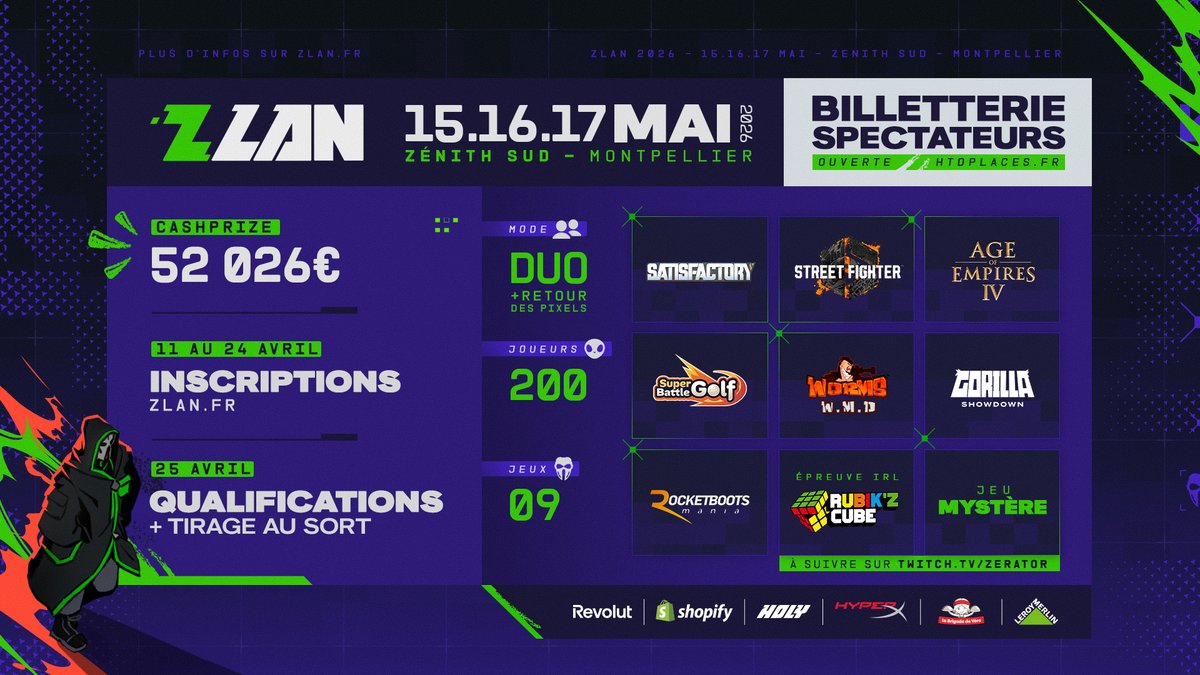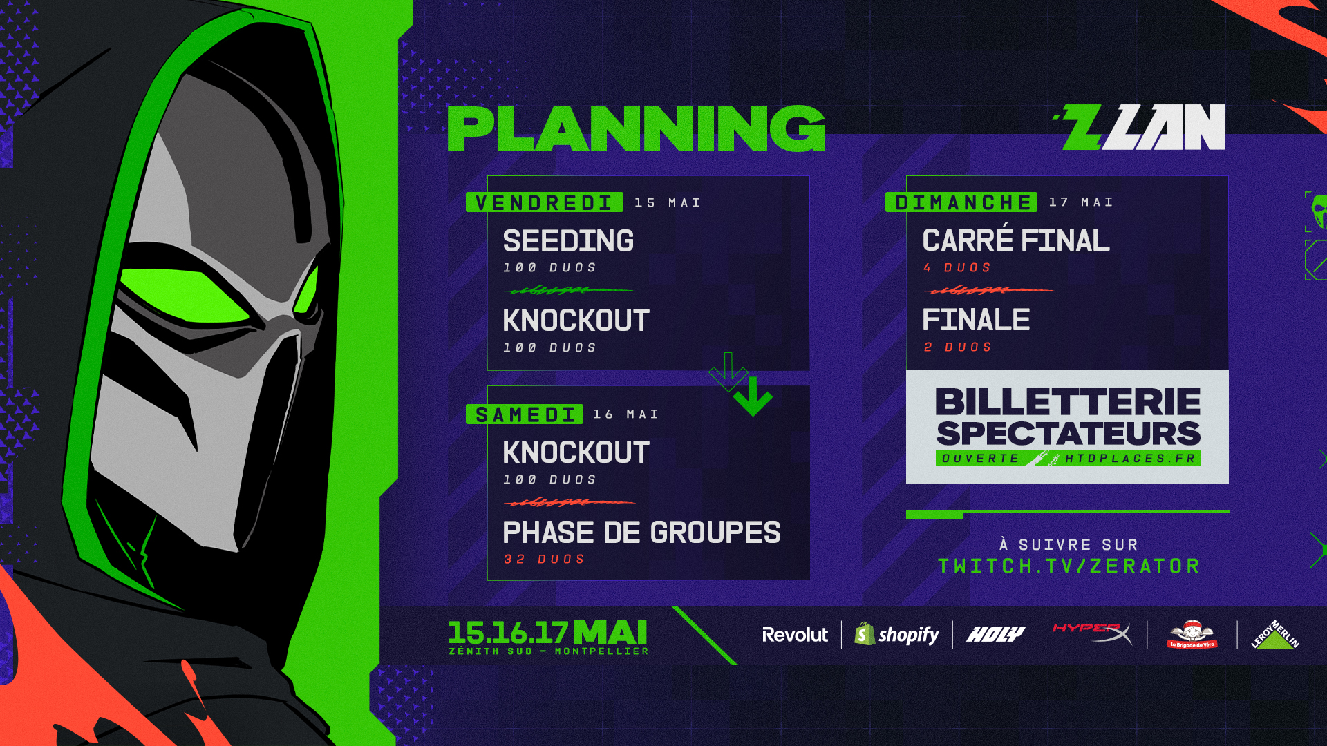 La septième édition de la ZLAN, produite par ZQSD Productions et orchestrée par ZeratoR, se déroulera du vendredi 15 au dimanche 17 mai 2026. Cet événement marque un tournant structurel, l'organisation ayant précisé qu'il s'agirait selon toute vraisemblance du dernier tournoi disputé sous ce format de duos. L'épilogue de la compétition se tiendra en public lors de la journée du dimanche, avec une ouverture des portes prévue à midi au Zénith Sud de Montpellier. Les billets pour assister à ces phases finales sont proposés à des tarifs compris entre quarante et cinquante euros, tandis que l'intégralité du tournoi sera retransmise en direct sur la chaîne Twitch de l'organisateur.