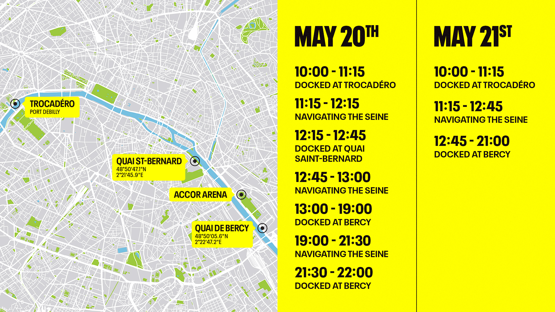 Le V.BOAT offrira également la possibilité de découvrir la ville de Paris grâce à un service de navette. Les horaires (heure de Paris) sont les suivants :
