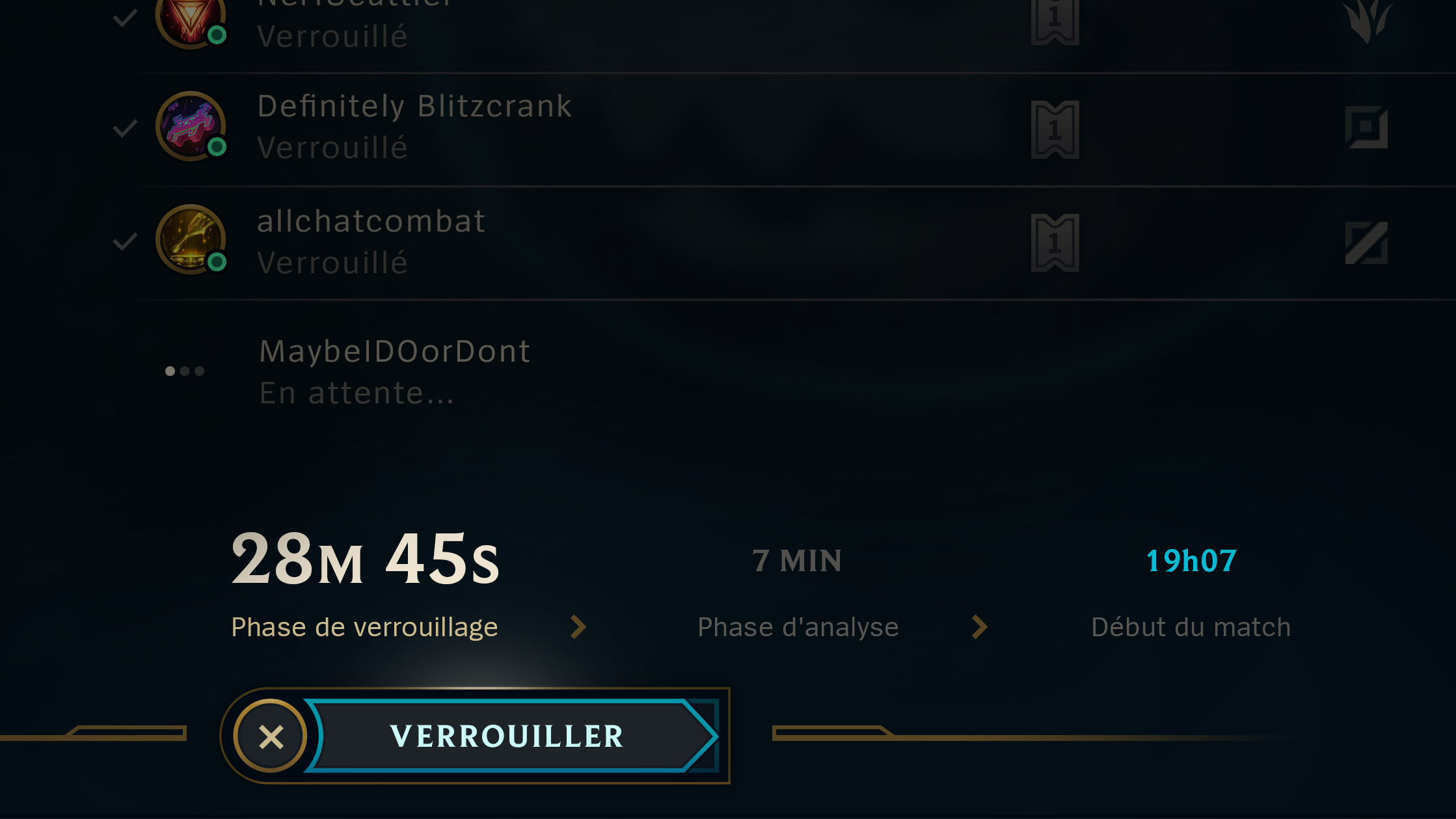 Chaque journée de Clash débute par une phase de verrouillage. Le verrouillage est possible trente minutes avant le début des matchs. Votre équipe peut se verrouiller à tout moment avant la fin du compte à rebours. Les matchs débutent dès la fin de la phase de verrouillage. Si l'un des joueurs de l'équipe ne se verrouille pas, aucun Chronomètre ne vous aidera. Votre équipe ne pourra alors pas participer aux matchs de la journée. Ne soyez pas AFK.