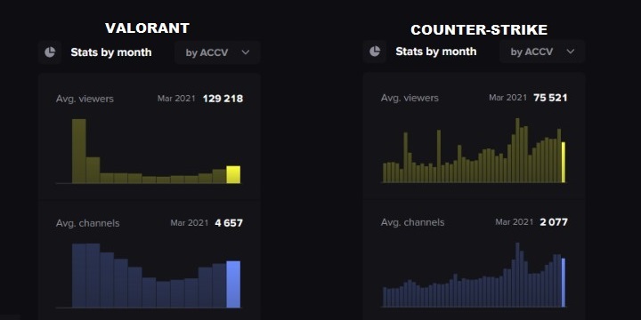 Toute d'abord Valorant a connu un démarrage en trombe en avril 2020 avec une moyenne de 478 600 viewers par jour, à cette époque on débutait les confinements à travers le monde ce qui a favorisé une hausse des audiences globales sur Twitch. Malgré tout cette performance de Valorant démontre tout l'intérêt que portaient les joueurs sur ce titre, et la promotion excellemment bien menée par le studio américain. À titre de comparaison, Counter-Strike: Global Offensive rassemblait seulement 120 667 personnes par jour sur le même mois ce qui correspond de plus à son record depuis son lancement en août 2012. Vous constatez déjà l'écart énorme qui existait à l'époque entre les deux jeux, et certainement pourquoi certains ont pu penser que CS:GO allait disparaitre.
