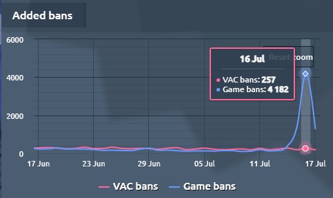 Le pic des bannissements est tombé le 16 juillet, lorsque les restrictions se sont imposées à 4 082 comptes, tous étant liées au jeu, tandis que le nombre d'interdictions via le Valve Anti-Cheat (VAC) n'a pas changé de manière significative par rapport aux jours précédents. Il n'y a donc pas encore eu de mise à jour particulière du robot, c'est encore et toujours l'homme qui doit intervenir pour lancer les vagues, sachant que Valve travaille toujours malgré tout sur une intelligence artificielle capable d'être beaucoup plus efficace que le VAC actuel.