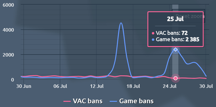 Au cours de la dernière semaine de juillet, les équipes en charge de CSGO ont poursuivi leur vague de bannissements qui a commencé au milieu du mois en cours. En témoignent les statistiques de ConVars, qui suit près de 9 millions de comptes de joueurs. Selon ConVars, plus de 11 000 comptes suivis ont été bloqués entre le 23 et le 30 juillet. Plus de 90 % d'entre eux sont des interdictions de jeu, tandis que le nombre d'interdictions via le Valve Anti-Cheat (VAC) n'a pas changé de manière significative par rapport à la moyenne, comme c'était déjà le cas lors de la précédente vague.
