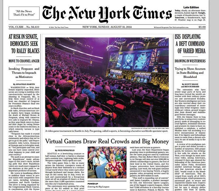 L'illustre et célèbre quotidien américain a publié à la Une de son édition du dimanche, un article sur la montée de l'esport dans le monde et a pris en exemple le célèbre MobA de Valve, DotA 2 et plus particulièrement le tournoi The International 4 qui a permis de réunir la bagatelle de 11.000.000 $ de dotation. Cet article est le premier d'une longue série de reportages qui montreront comment les jeux vidéo sont devenus un sport à part entière.