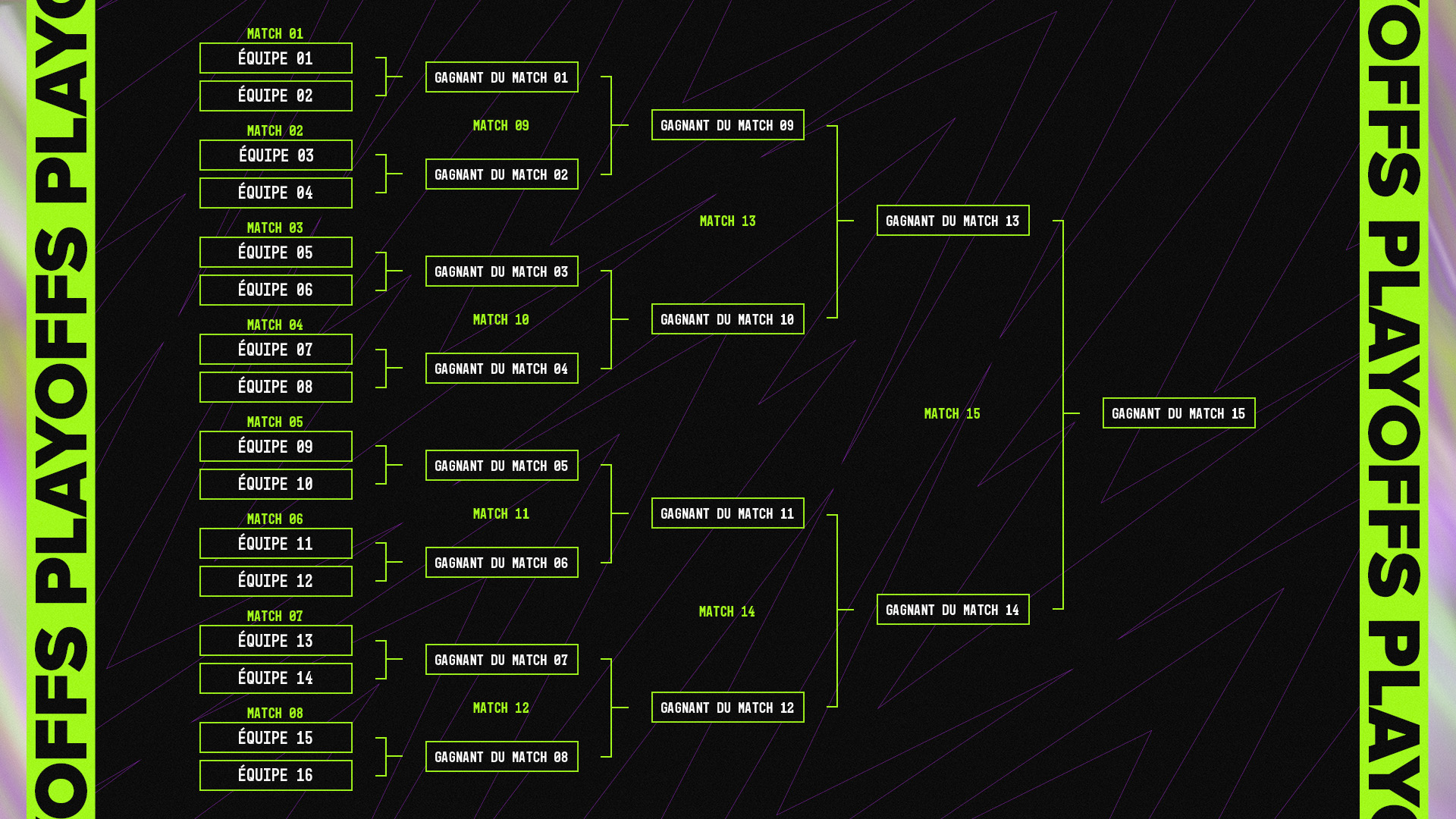 - Les matchs seront en une manche gagnante, sauf pour les qualifications/éliminations qui seront en deux manches gagnantes.