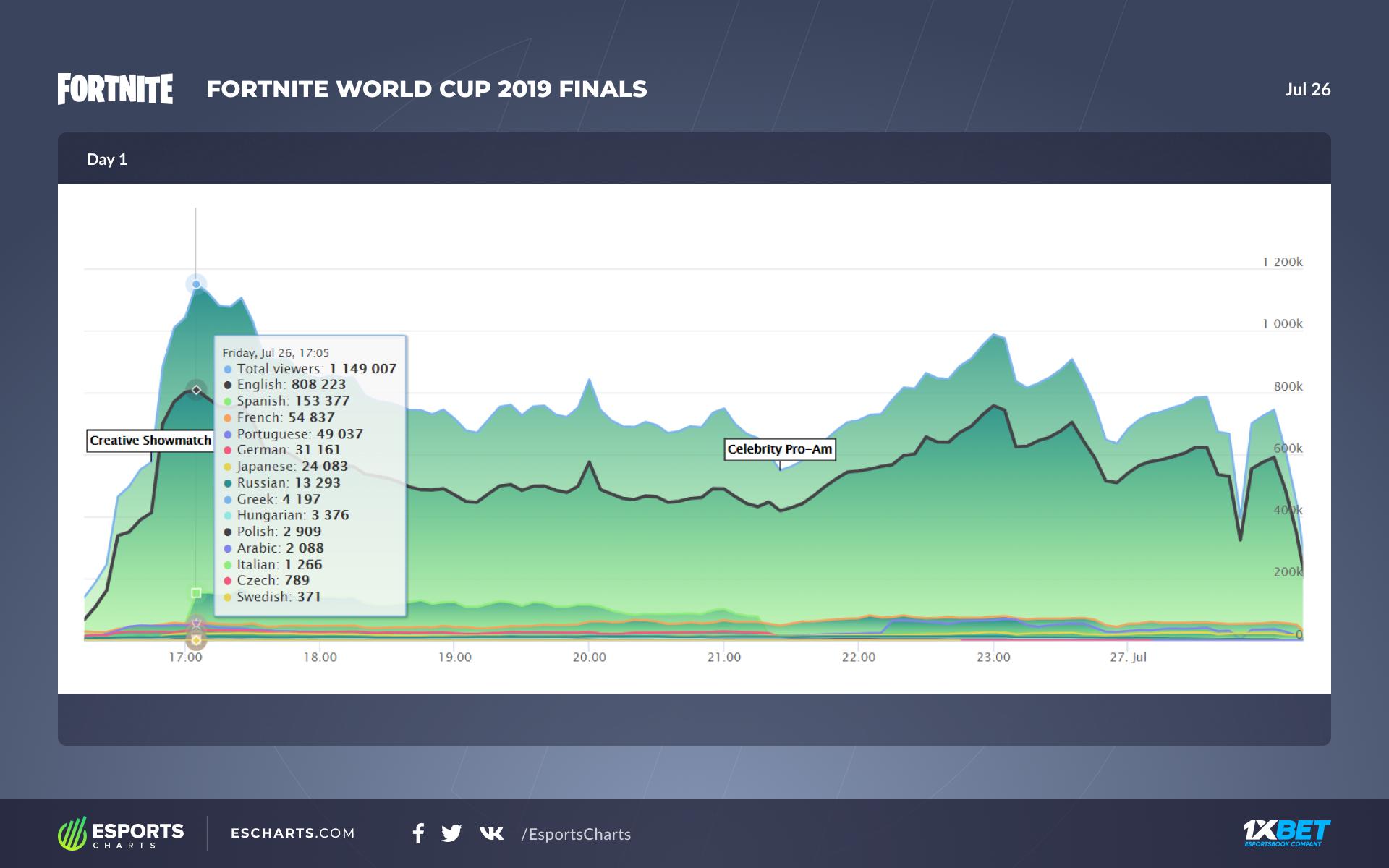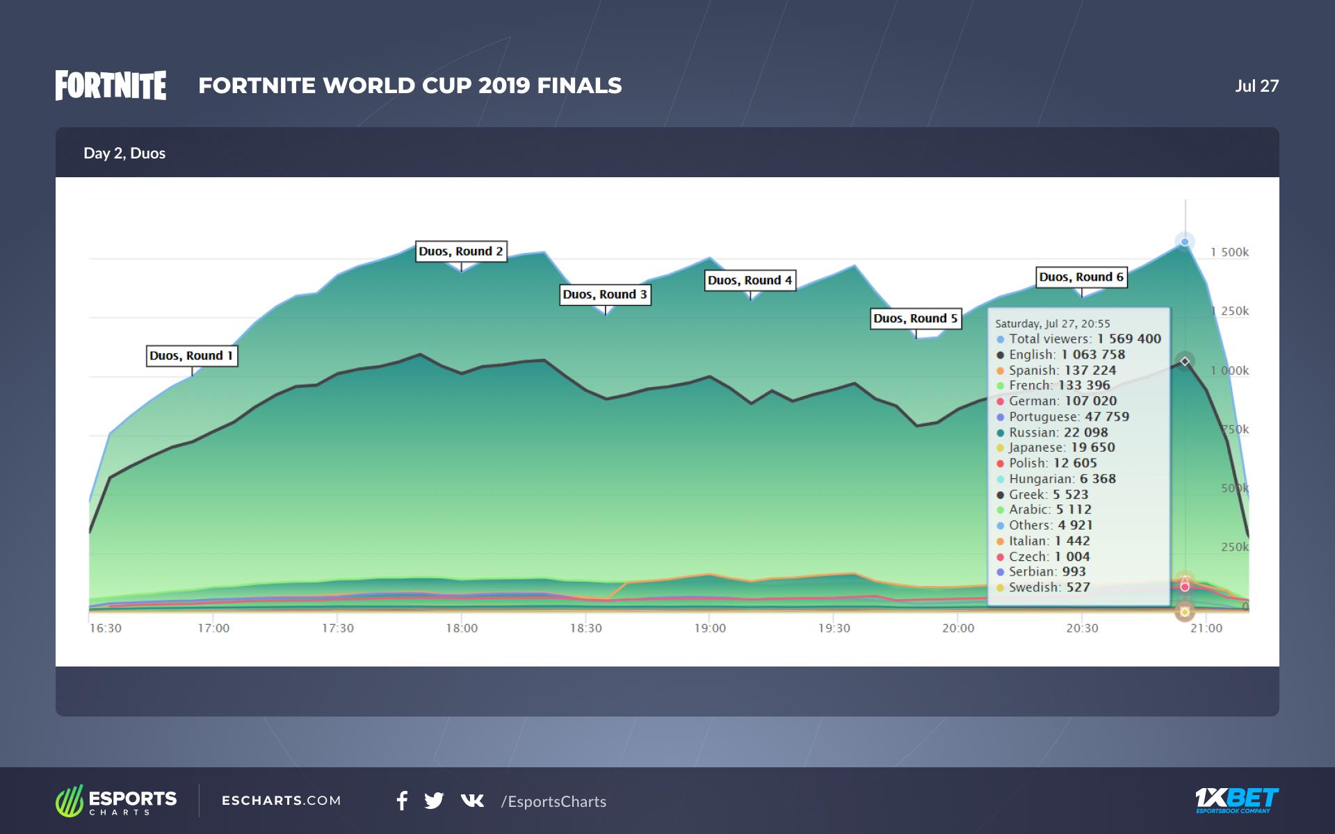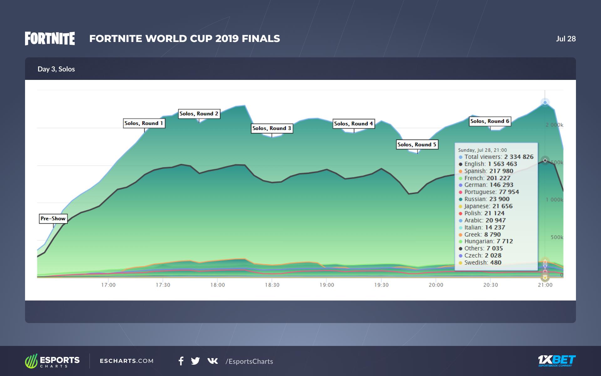Sans surprise, c'est la troisième journée de compétition, consacrée au tournoi en mode solo, qui a attiré le plus de monde. Plus de 2 millions de personnes ont assisté au sacre du compétiteur nord-américain de la structure Sentinels âgé de seulement 16 ans, Kyle "Bugha" Giersdorf. Sur les 2,3 millions de personnes pour le 6e et dernier round, Esports Charts nous rapporte que 1,2 million venaient de la plateforme Twitch, 1,1 million de YouTube et 71 000 de Facebook.