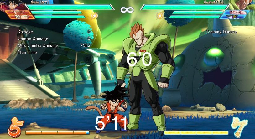 Sur cette image, la taille des personnages dans le jeu avec affichage de leur taille réelle selon le manga (1m55 pour Goku enfant, et 1m82 pour C-16)