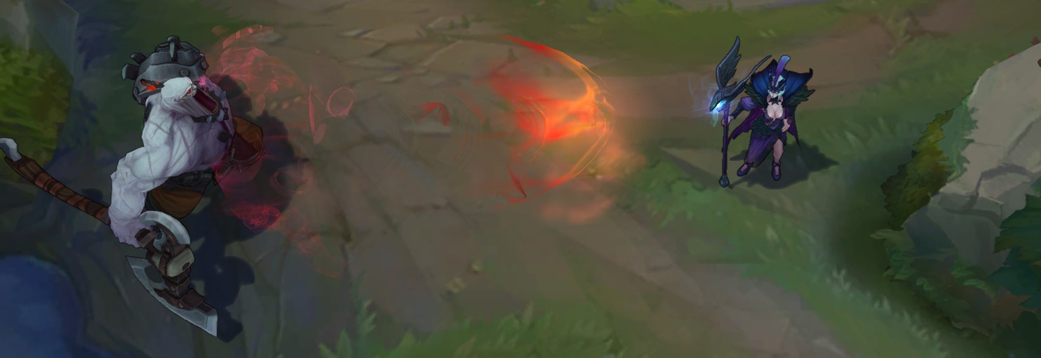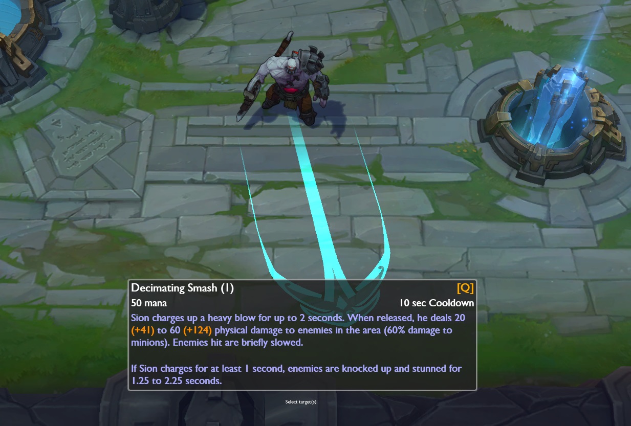 Sion s'immobilise pour préparer une attaque qui frappera une large zone devant lui. Plus Fracas meurtrier est chargé longtemps, plus les dégâts augmentent. À partir de 50% de charge, l'attaque projette en l'air tous les ennemis touchés.