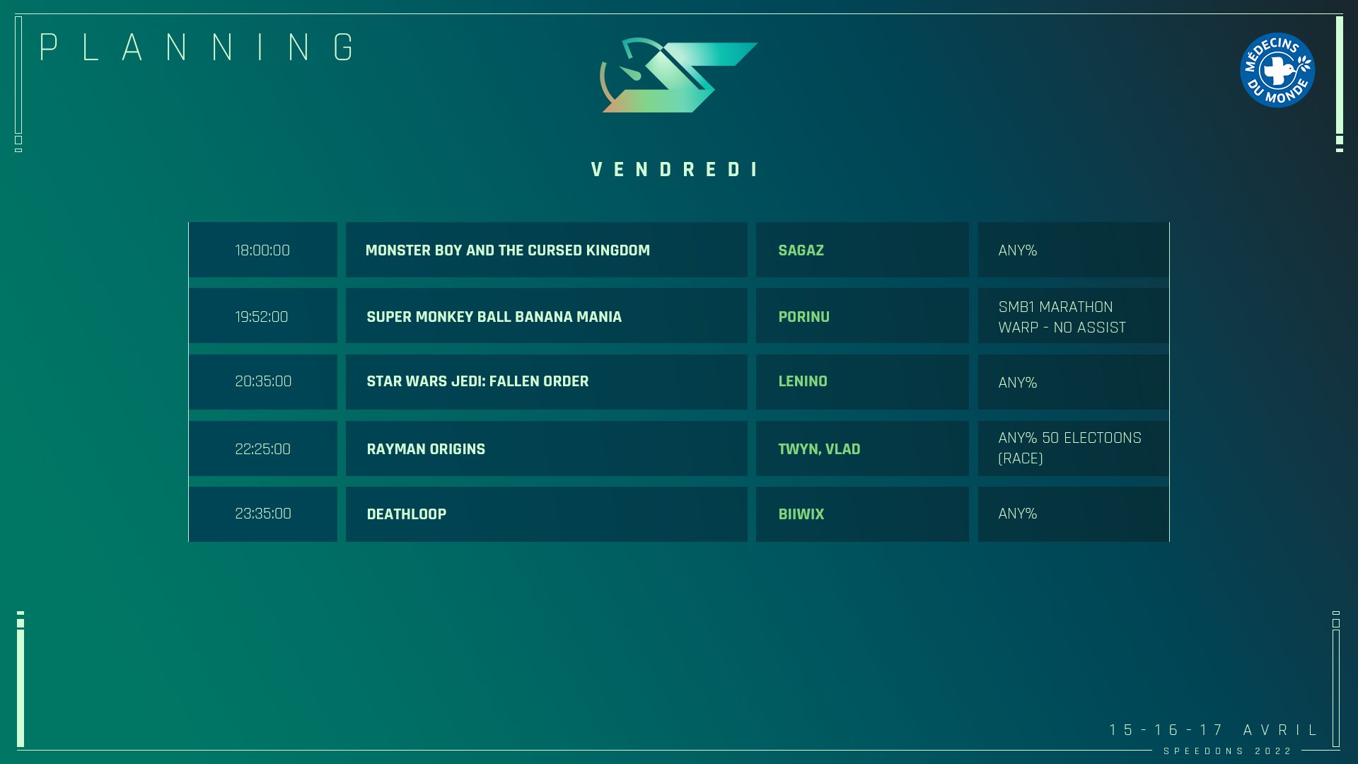 SpeeDons est un marathon de Speedrun retransmis en live sur Twitch et qui a pour vocation de collecter un maximum de dons pour l’association Médecins du Monde. Aux côtés de MisterMV, nous retrouverons ZeratoR, Laink, Shisheyu et DamDamLive.