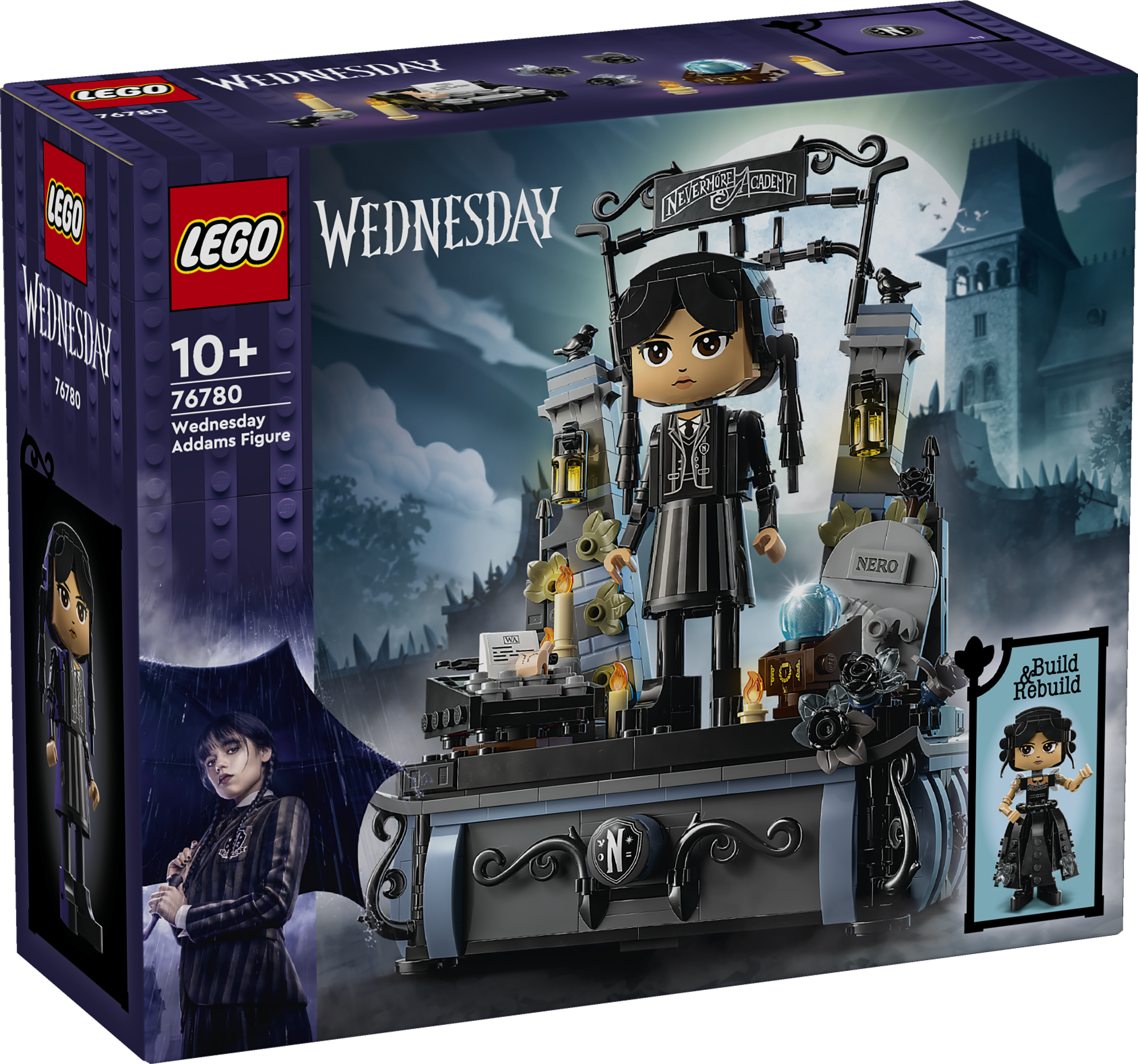 Le deuxième set, Wednesday Addams Figure (76780), est une version plus imposante de l’héroïne. Avec 702 pièces, cette figurine articulée de Mercredi propose deux tenues interchangeables (son uniforme et sa robe de bal), ainsi que divers accessoires issus de la série, comme une boule de cristal et une machine à écrire. Ce modèle est destiné autant à la décoration qu’au jeu.