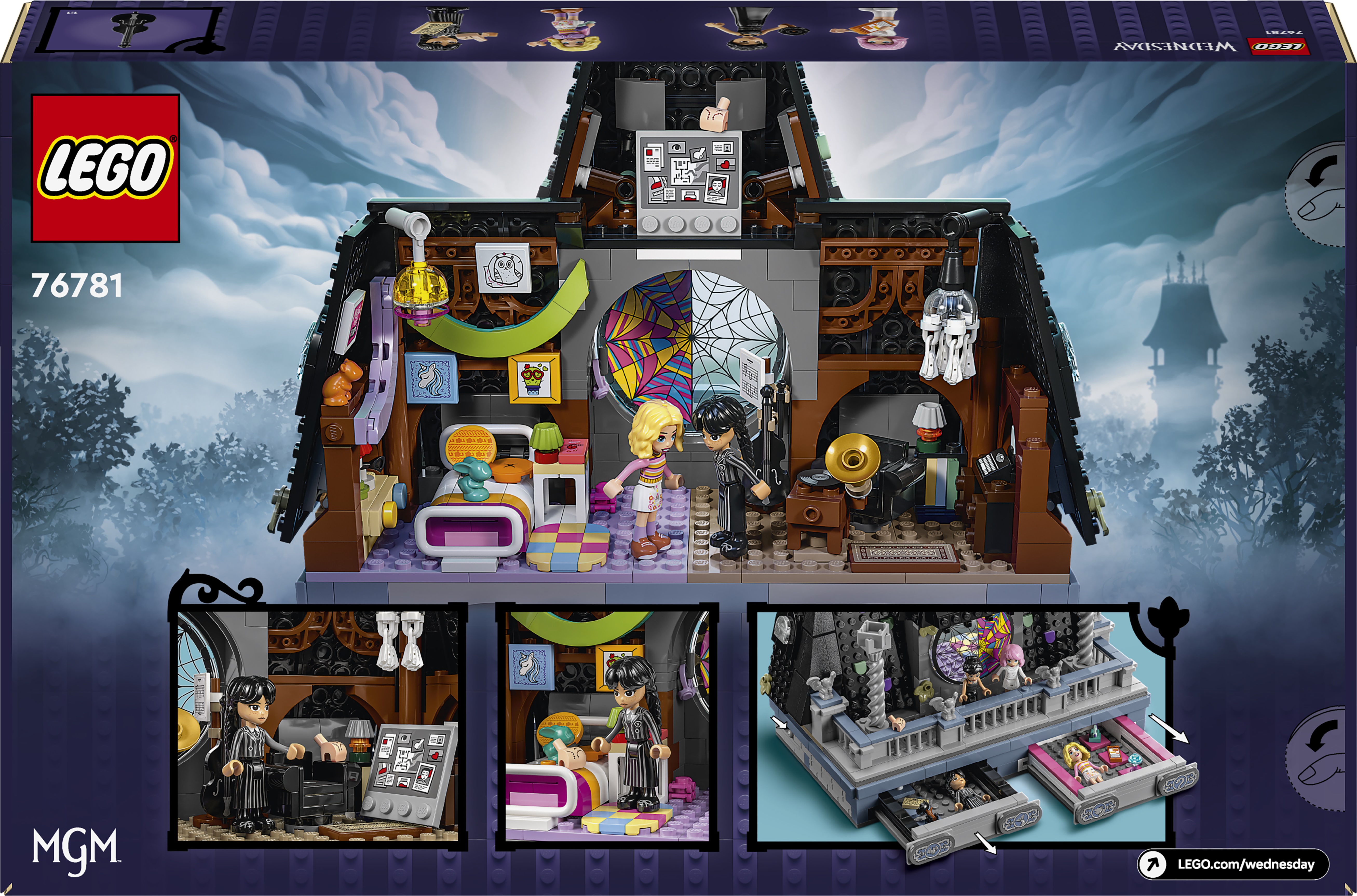 Le set phare de cette collection est le Wednesday & Enid’s Dorm Room (76781). Ce modèle de 750 pièces recrée la chambre partagée par Mercredi et Enid à la Nevermore Academy, avec des détails soignés tels que des gargouilles, une machine à écrire, un violoncelle, et même un tableau de mystères. Le set comprend également des mini-figurines de Mercredi et Enid, ainsi que leur fidèle compagnon « Thing ». Les concepteurs ont inclus des tiroirs secrets pour ajouter un élément de surprise aux constructions.