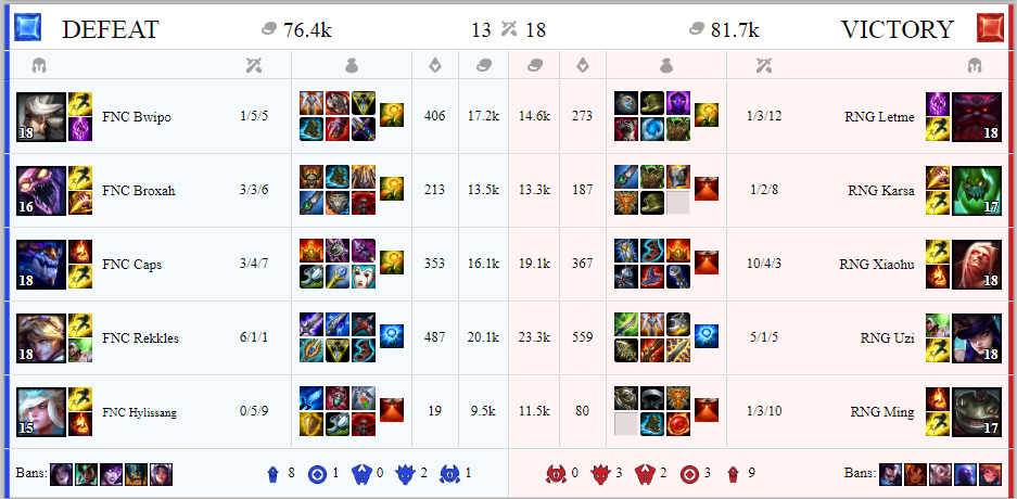 Il y a eu du mieux par rapport au début du tournoi, mais nous avons retrouvé dans cette demi-finale les mêmes points faibles et erreurs que lors de la phase de groupe : des drafts par forcement optimisées, un manque cruel de vision, une mauvaise gestion des teamfights et un contrôle des objectifs funeste. Malheureusement, ce genre de petites bévues se paye cher face à une équipe comme RNG. Les Chinois ne sont pas en reste niveau erreurs dans ce BO5 mais leur macro et leurs stratégies de jeu leur ont toujours permis de prendre le meilleur sur leurs adversaires.