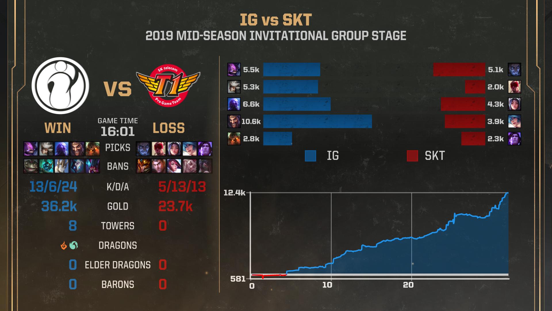 Qu'ils aient sous-estimé leurs assaillants (ce qui semble peu probable) ou qu'ils se soient trompés de stratégie pour affronter les Invictus Gaming, Faker et ses compagnons sont dans les deux cas totalement passés à côté de leur game, et ce dès la draft ; le duo Sona/Tarik n'a été d'aucune utilité et s'est littéralement fait détruire par le Draven de JackeyLove. Invictus signe ici un nouveau record du monde avec la game la plus rapide en tournoi international officiel.