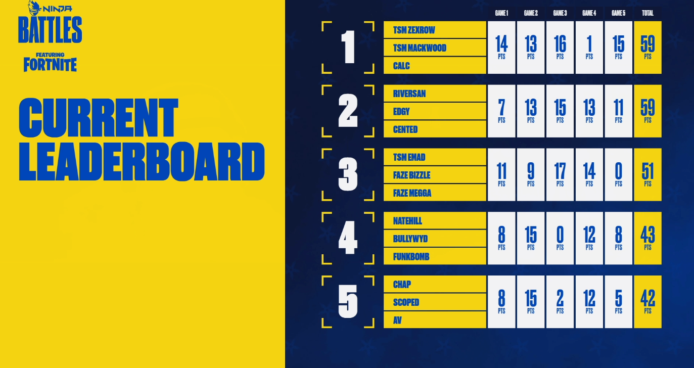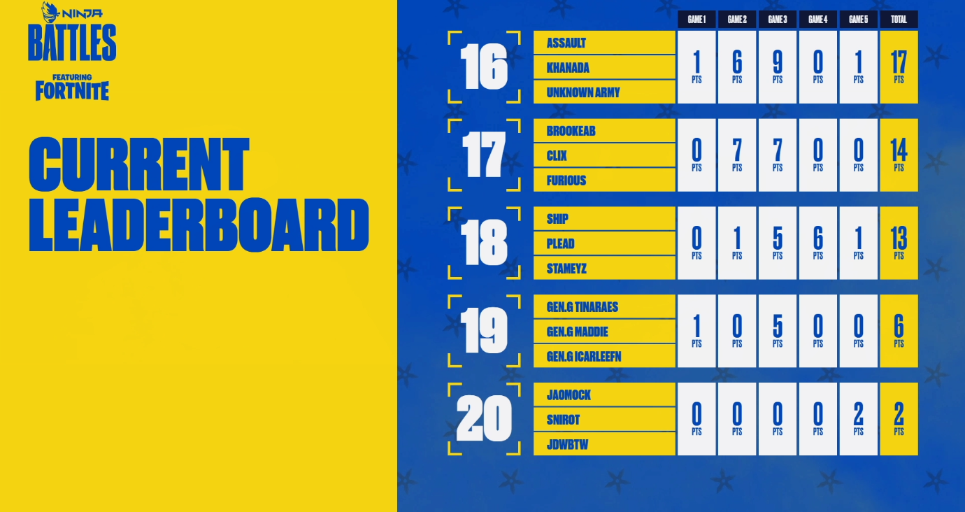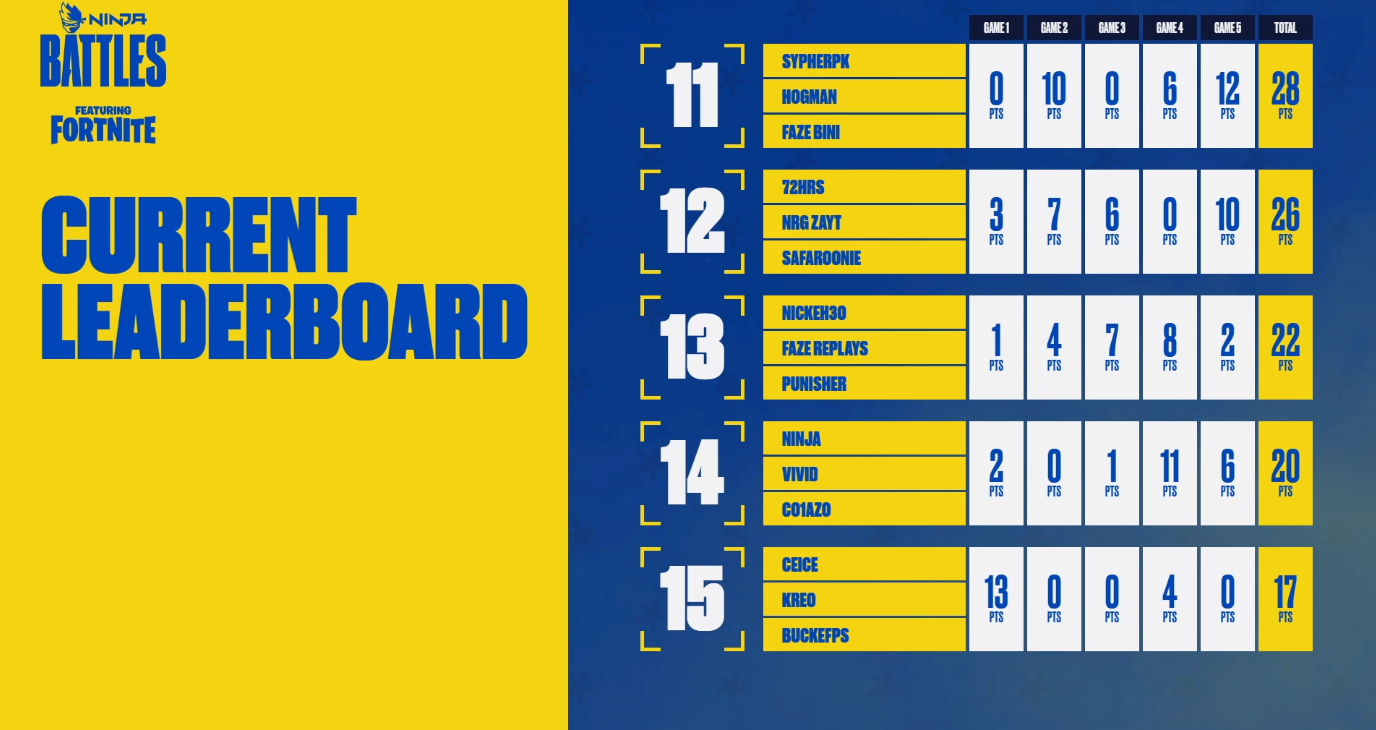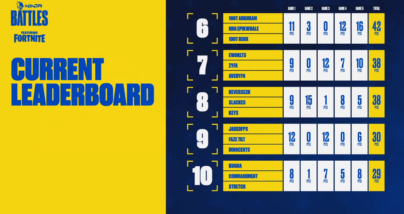 Les Ninja Battles se déroulent tous les jeudis, à partir du 28 mai et jusqu’au 2 juillet inclus à 21h heure française. Le tournoi est en partenariat avec Fortnite et sera diffusé en exclusivité sur la chaîne Mixer de Ninja. Aucune qualification ouverte n’est pour l’instant prévue pour le tournoi, tout sera uniquement sur invitation contrairement à la BenjyFishy cup par exemple. Au niveau du cahsprize, 80 000$ seront distribués chaque semaine aux participants pour un total de 480 000 $ sur la totalité du tournoi. En ce qui concerne le format, les Ninja Battles se déroulent en trio, un mode globalement apprécié des joueurs professionnels.