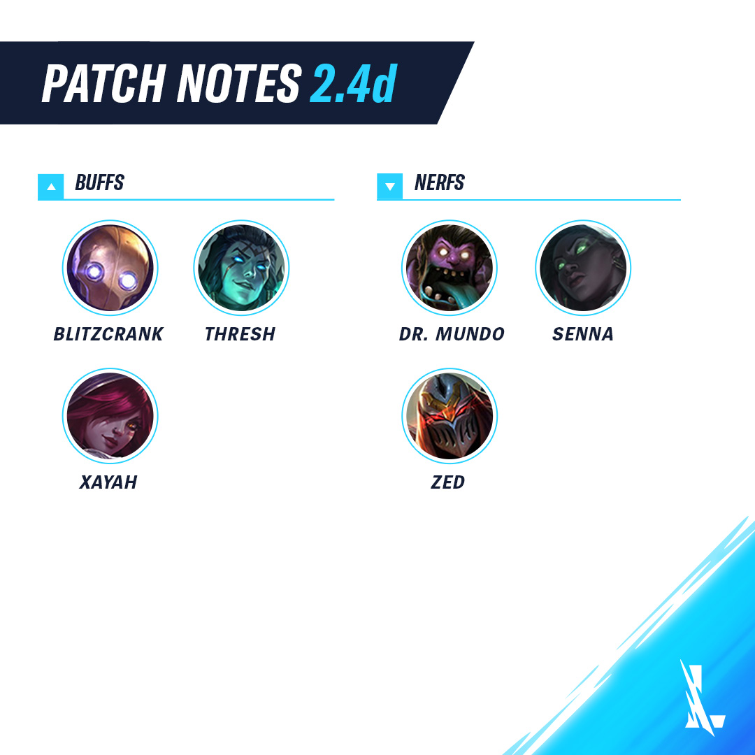 Le dernier équilibrage du cycle 2.4 s'occupe de la domination de Zed, et quelques réglages concernent les supports : Blitzcrank, Thresh et Senna. Nous restons modestes dans ce dernier patch d'équilibrage avant la sortie de la 2.5 en octobre !