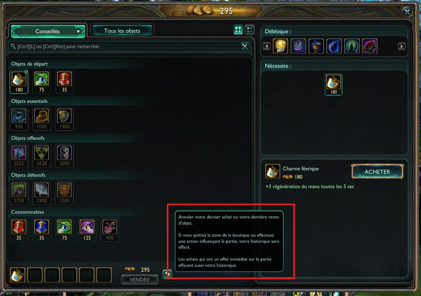 Contexte : vous avez acheté par mégarde un BF Glaive pour Swain ? Nous avons ajouté un bouton Annuler dans la boutique afin de permettre aux joueurs dont les souris sont les plus glissantes d'annuler un achat récent. Vous ne pouvez pas annuler un achat si l'objet en question a déjà eu un impact irréversible sur la partie (infliger ou réduire des dégâts, soigner, conférer un bonus à un équipier, etc.).
