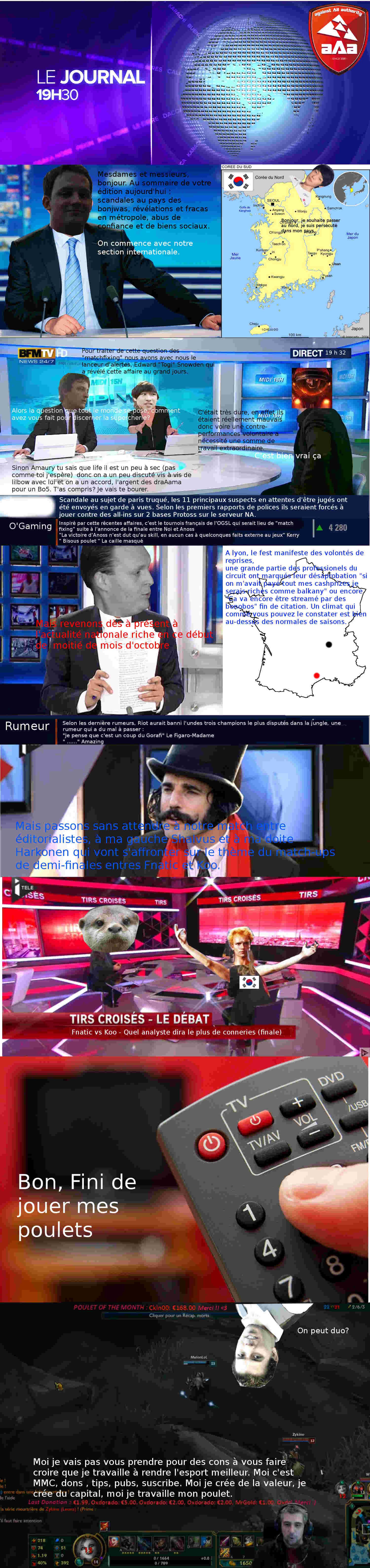 Peuple d'aAa bonjour. Le mois d'octobre a été chargé en compétition et contenu, et faire la part des choses n'a pas été facile. En effet, entre le match fixing sur Starcraft 2 et les championnats du monde sur League of Legends… le contenu était très diversifié. De ce fait, le choix a été ardu, car la qualité était globalement très présente dans un top qui ne pouvait se départager facilement (presque comme d'habitude, mais là encore plus). Cette édition sera un peu spéciale à cause d'un homme (Harkonen), car je fus dans une incapacité totale de départager la deuxième et troisième place. Ainsi, j'ai décidé, en vertu du décret divin que m'a accordé Zidwait, d'effectuer une petite modification au niveau du classement. Les places 2 et 3 seront regroupées.