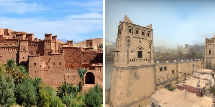 Toutefois pour vraiment vous imprégner de Mirage et vivre véritablement l'illusion, on vous conseille plutôt d'aller dans le désert pour visiter le ksar d’Aït Ben Haddou. Situé au centre du pays au pied des montagnes de l’Atlas, il s'agit d'un village fortifié traditionnel de la civilisation pré-saharienne. Situé à 30 km au nord-ouest de la ville marocaine de Ouarzazate, il s'agit d'un exemple typique de village, datant du 17ème siècle et entièrement construit avec des matières organiques locales. D'ailleurs ses couleurs sont différentes de celles de Mirage puisqu'il s'agit d'un plâtre de boue rouge. C'est certainement le voyage le plus dépaysant que vous pourrez faire afin d'aller visiter un lieu dont votre FPS favori s'est inspiré, malheureusement une fois les murs franchis vous ne retrouverez plus rien de réellement similaire à la carte que vous connaissez, seule la vue au loin finalement vous rappellera Mirage.