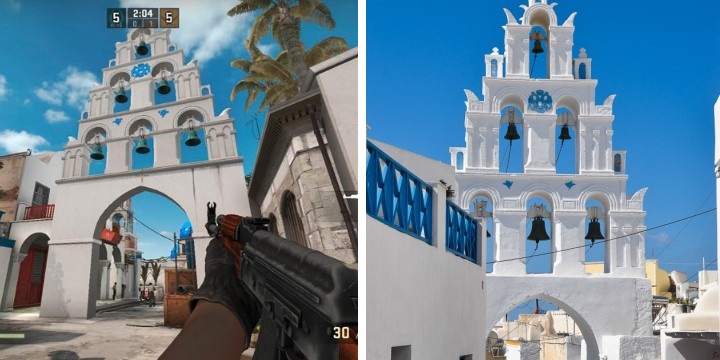 Cela explique cette inspiration très hispanique du lieu. Les similarités sont vraiment frappantes, que ce soit les cloches ou la fontaine dans la base des terroristes, le chemin qui vous mène au site B lorsque vous êtes en défense, les vignes, les ruines en B, les arches, la fontaine octogonale, la biblitothèque et même le cimetière et ses barrières métalliques. Il ne fait aucun doute que son créateur, pour CSGO, a visité le lieu et a souhaité s'en inspirer.