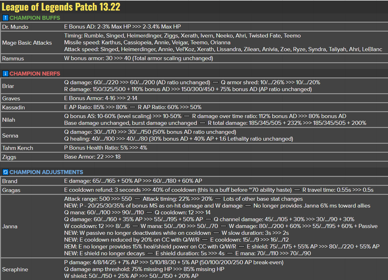 Un nouveau cycle a fait son apparition sur le PBE depuis plusieurs jours, le patch 13.22, et avec lui une série de nouveaux équilibrages. Au programme notamment, un buff de la vitesse d'attaque des mages, Mundo et Rammus, des nerfs pour Briar, Graves et Kassadin, et des ajustements sur Brand, Janna et Seraphine.