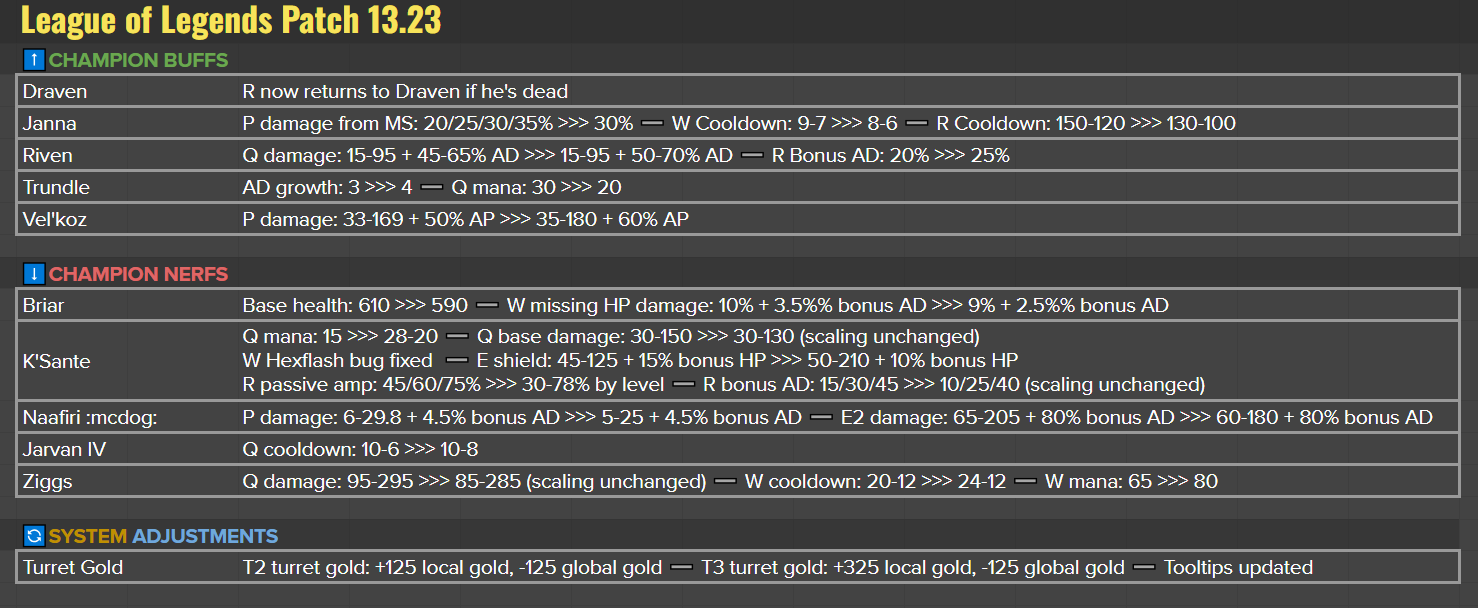 La mise à jour n°23 pour la saison 2023, attendue dans la prochaine version, présente quelques évolutions. Outre des renforcements (buffs) et des affaiblissements (nerfs) pour 8 champions, ce patch apporte également quelques modifications au niveau des golds de la tour intérieure et de la tour de l'inhibiteur afin de donner une plus grande part de golds. Étant donné que le snowball est à l'un des niveaux les plus bas actuellement, Riot Games pense que cela permettra de l'aider un peu tout en favorisant les rôles comme la toplane qui passent plus de temps sur les side lanes.