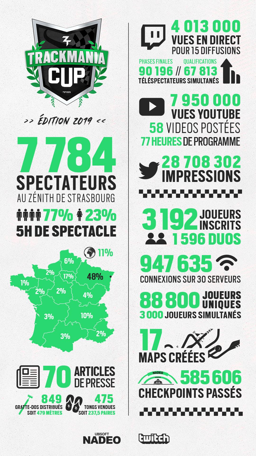 Le week-end dernier, les gradins du Zénith de Strasbourg vibraient au chant des quelque 7700 personnes qui avaient fait spécialement le déplacement pour encourager les meilleurs duos qualifiés pour les finales de la ZrT Trackmania Cup 2019. Bien que l'euphorie ne soit pas encore réellement tombée et que la communauté se prépare déjà à envahir l'AccorHotel Arena de Paris, ZeratoR a fait un premier bilan de cette édition et nous a dévoilé quelques données. Quand nous voyons les chiffres annoncés, nul doute : cette ZrT Trackmania Cup 2019 a été un succès.