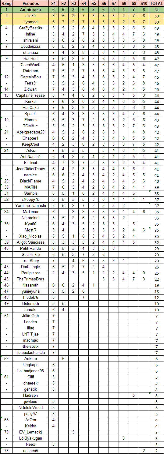 La semaine fut belle, avec un p'tit 3-1 mis par BDS à Gamers Origin et une bonne piquette des familles (3-0) infligée par les Vitality aux Misfits, les spectateurs en ont eu pour leurs boulasses. Dans les autres belles perf', nous avons celles des pronostiqueurs shiraishi, Tens3i et Apexpredator28 qui ont claqué pas moins de huit points sur dix possibles, not bad du tout ! Mais c'est pas pour autant qu'ils sont les meilleurs puisque le top 3 est occupé par Amaterasu, alle80 et kyomed, le bien joué à eux. Petit coucou au passage à un nouveau participant, ricorico5.