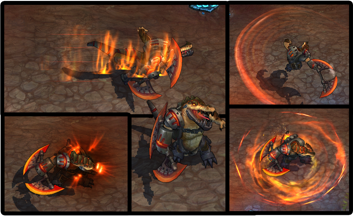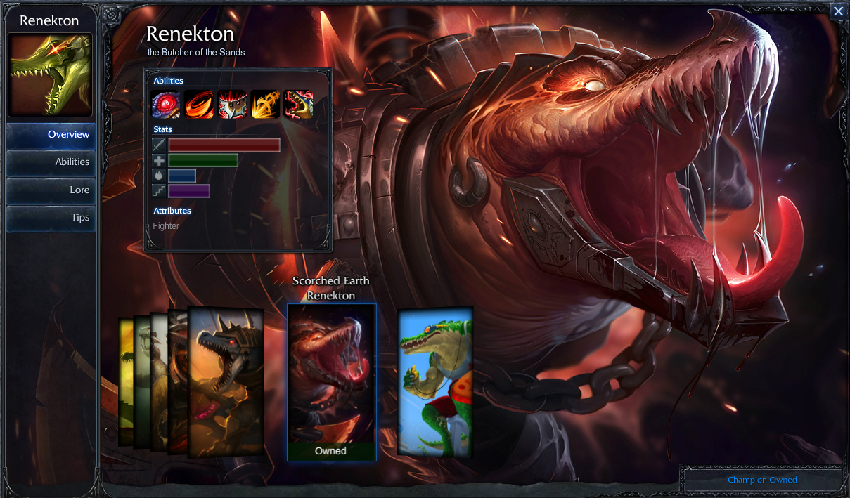 Des siècles d'emprisonnement ont alimenté la fureur de Renekton de la terre brûlée. Aujourd'hui, cette fureur va s'abattre sur ses ennemis. Armé de son arme volcanique, il tranche la chair comme les os pour accomplir sa vengeance. La boucherie ne fait que commencer, les flammes de la fureur engloutiront tous ceux qui ont voulu enfermer Renekton de la terre brûlée.