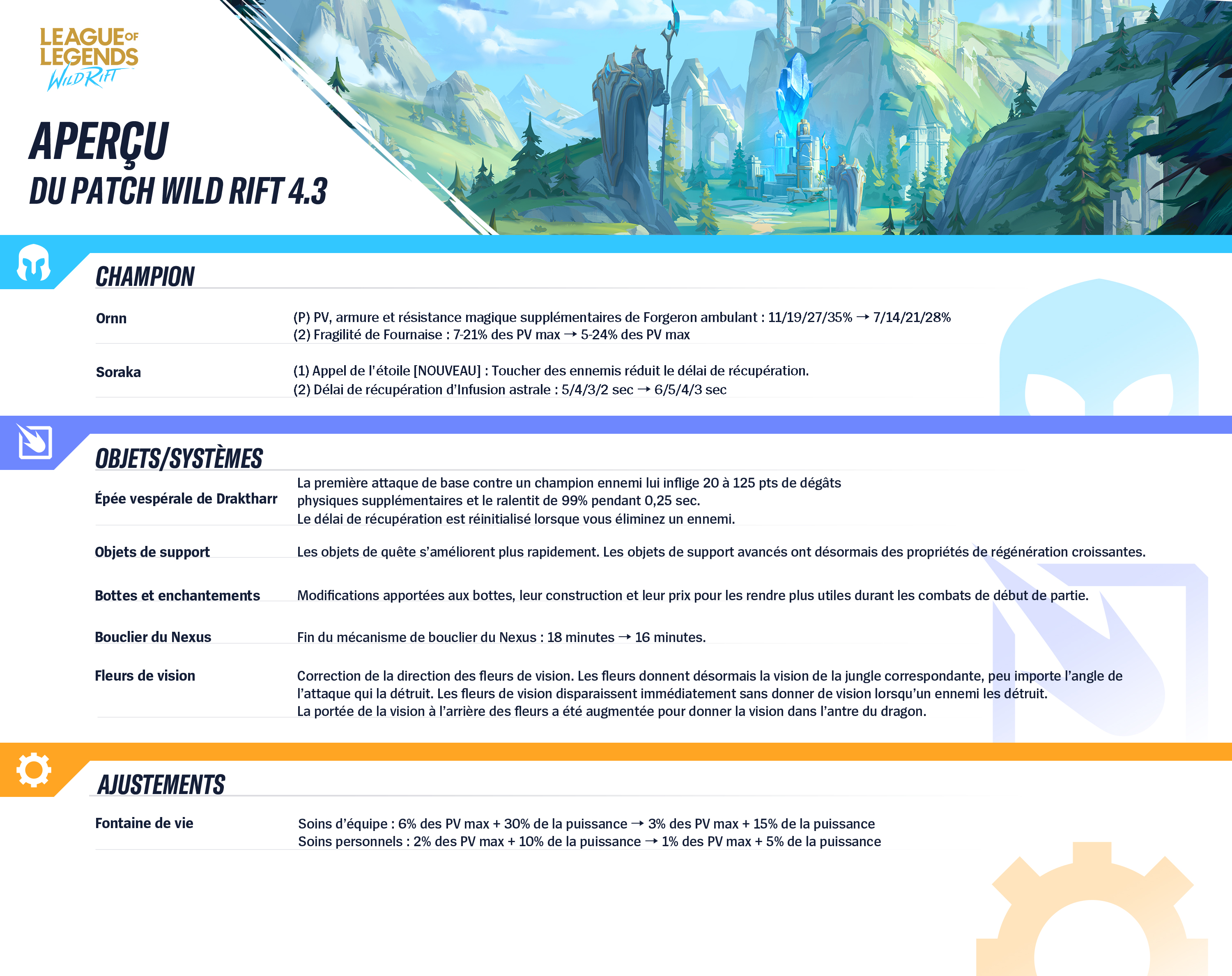 Le patch 4.3 va bientôt faire son apparition sur les serveurs live de League of Legends Wild Rift, et à cette occasion, Riot Games a dévoilé une liste non exhaustive des différents équilibrages qui seront mis en place avec cette mise à jour ; la liste complète de tous les changements sera normalement dévoilée d'ici ces prochains jours. Dans les différents équilibrages dévoilés ce jour, nous retrouvons Ornn, Soraka, ainsi que divers objets comme l'épée vespérale de Drakthar.