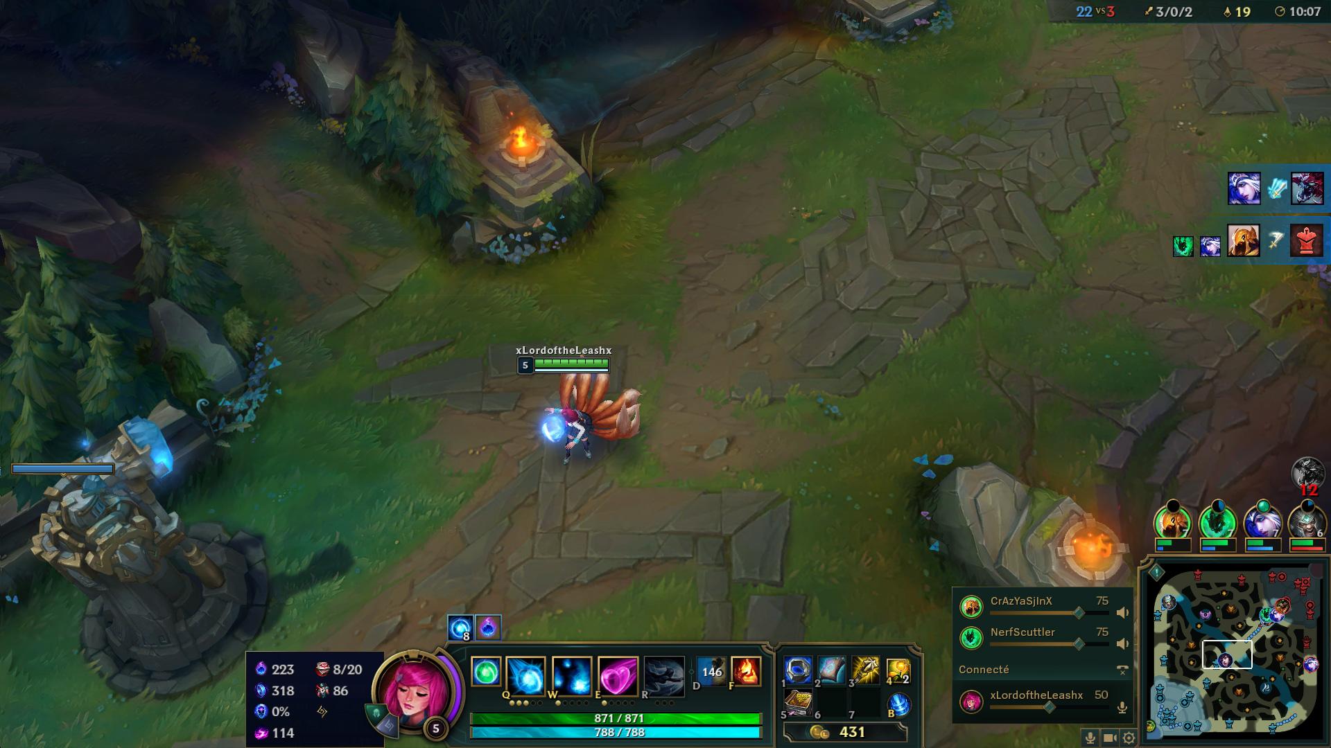 Après le patch 8.6, votre groupe ne pourra plus ignorer vos appels au secours, car il entendra votre voix dans le chat vocal. Le chat vocal ne fonctionne que pour les groupes qui ont rejoint une file ensemble. Si vous jouez en duo, vous n'entendrez que la voix de votre binôme. Dès que vous rejoignez le groupe d'un ami, vous serez automatiquement connecté au chat vocal et vous le resterez tant que vous jouerez ensemble. Nous avons tous cet ami discret qui ne hurle pas de rage même quand il se prend un gank mortel : cliquez simplement sur la touche « tab. » pour ajuster les paramètres du chat afin de pouvoir l'entendre. Le chat vocal est disponible pour n'importe quel groupe de deux joueurs ou plus.