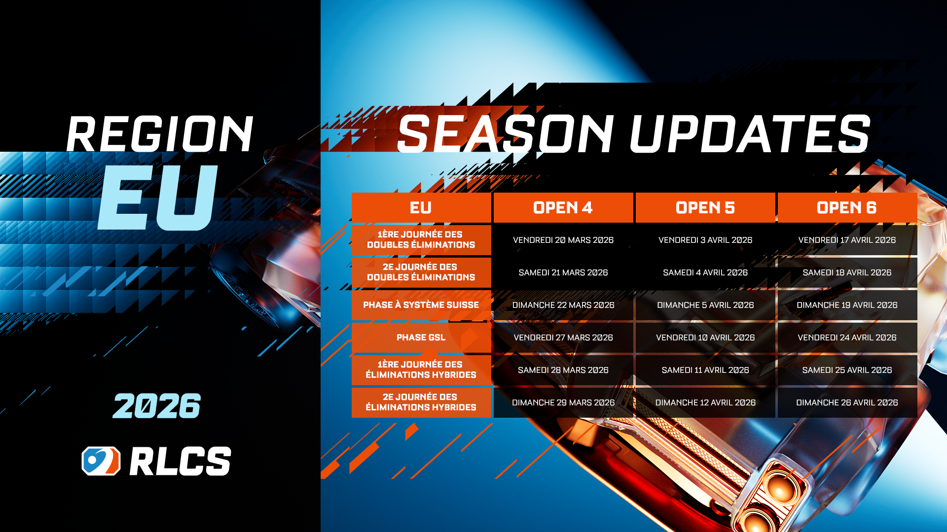 La saison 2026 des RLCS débutera plus tôt que d'habitude. En effet, les Opens en ligne commenceront en novembre 2025, et seront suivis d'un événement totalement inédit sur trois jours dans les studios de BLAST à Copenhague, au Danemark, entre le 5 et le 7 décembre pour donner le coup d'envoi de la saison 2026 des RLCS !