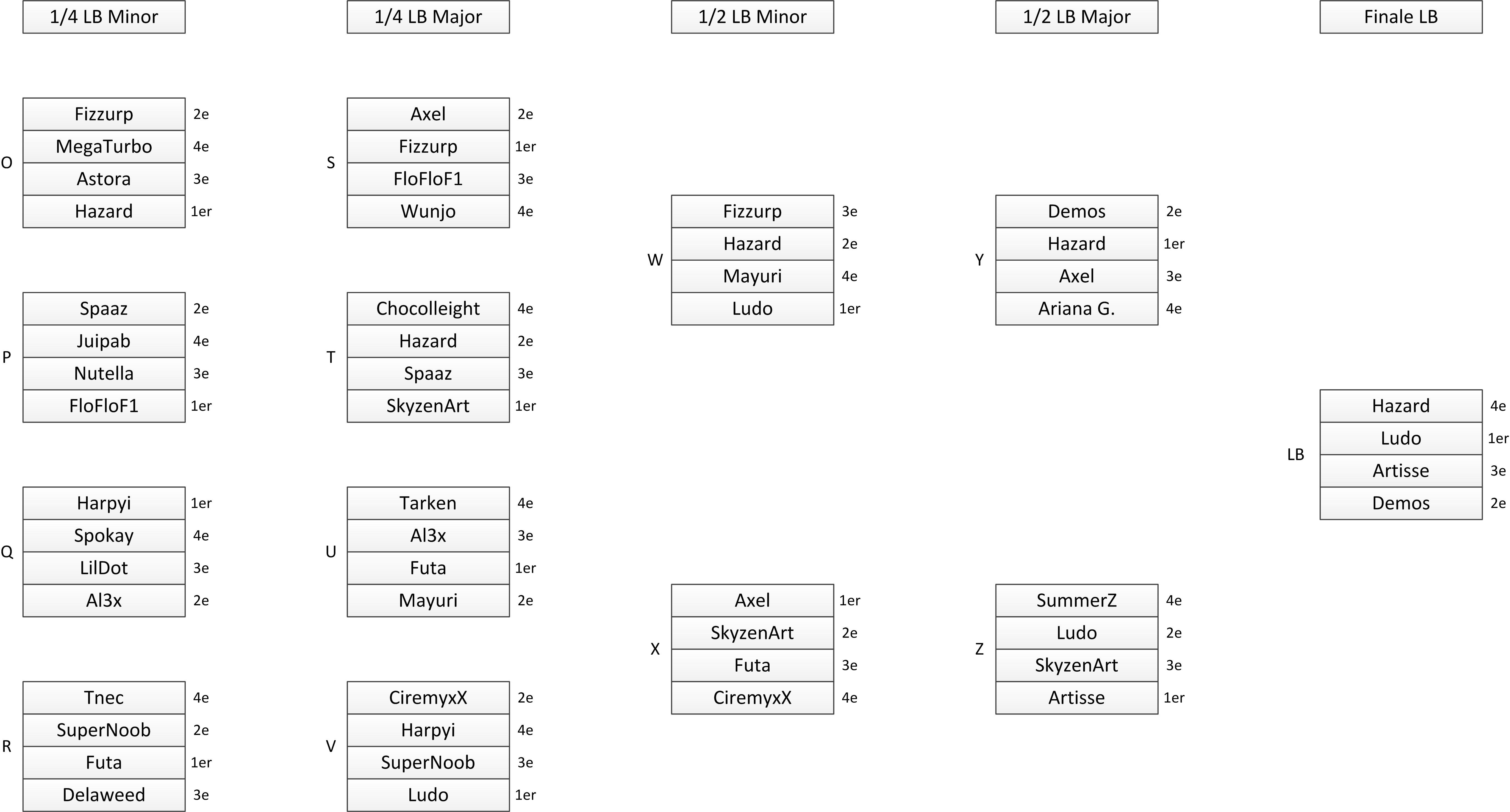 1/4e de finale WB : Sixela, Tourist et Morhpeo ont une nouvelle fois tenu leur rang. Après avoir terminé aux 3 premières places des qualifications, puis remporté leurs 1/8e de finale, ils ont récidivé en 1/4. De son côté, Ludo, 4e des qualifications, a été sorti, et devra passer par le Loser Bracket pour espérer disputer la Grande Finale.