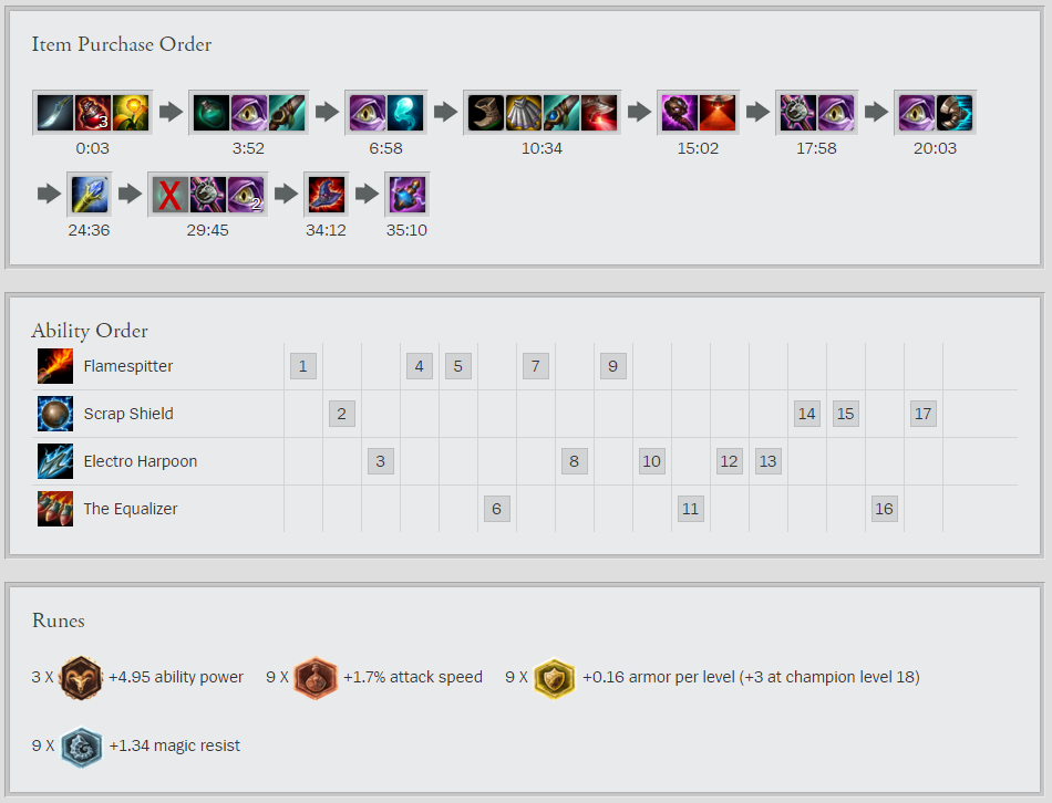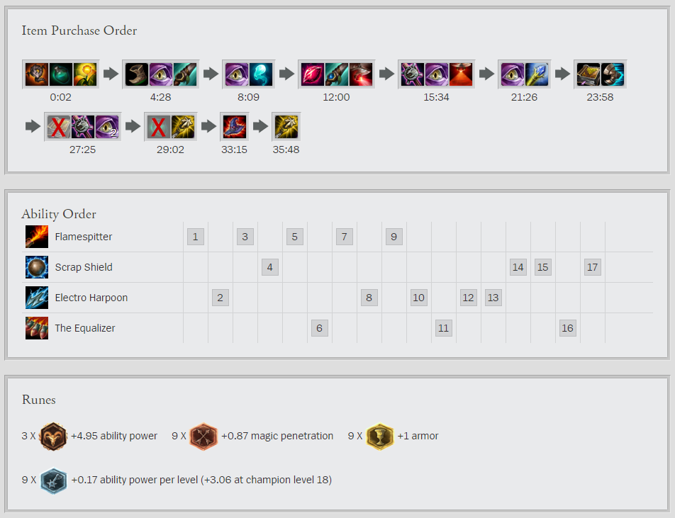 Tout d’abord, Rumble n’est pas le seul pick inhabituel que nous avons vu lors de ce match, vu qu’il y avait aussi un Rammus top. Néanmoins dans une méta aussi centrée sur les ADC (Corki, Graves, Lucian, Kindred etc etc), nous nous attendions plus ou moins à voir ce pick sortir un jour alors il nous a beaucoup moins intrigués qu’un Rumble jungle. Pourquoi ce pick là en jungle ? Premièrement nous nous sommes demandé si cela pouvait avoir un rapport avec le nouvel objet pour les mages en jungle, mais après quelques réflexions même s’il est certainement le meilleur objet jungle actuel à faire sur un mage (et Udyr), il ne synergise pas plus que ça avec Rumble. Certes, l’objet est bon, mais guère plus que sur une Elise ou tout autre jungler AP souhaitant faire des dégâts. Suite à cette réflexion, nous avons analysé les sorts de Rumble et leur utilité en jungle.